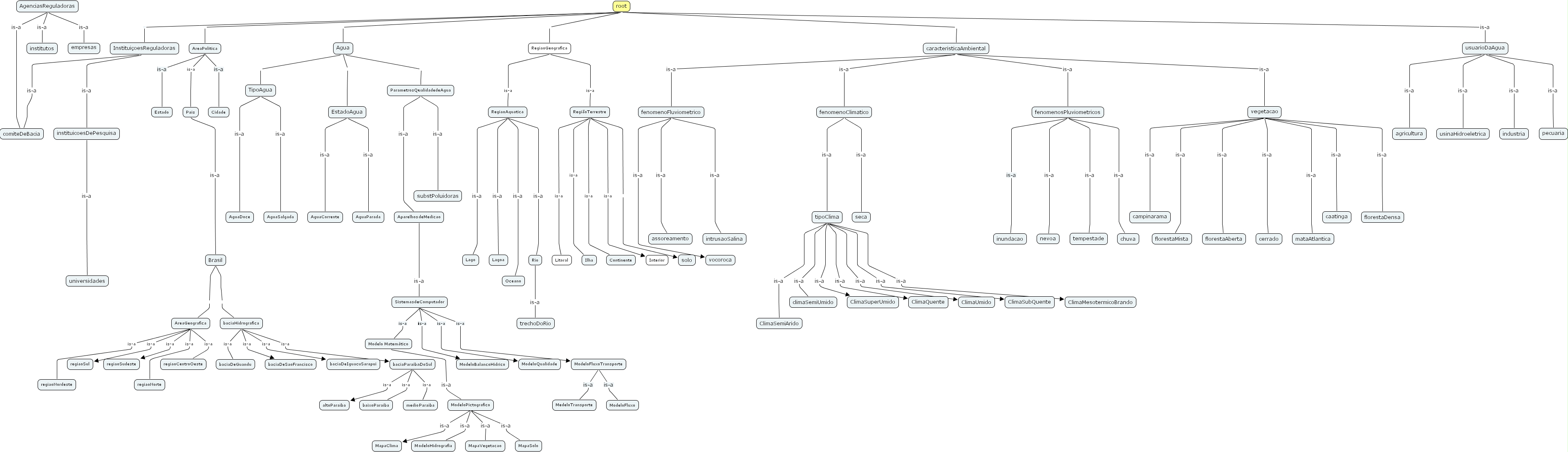 Regi�oTerrestre is-a Ilha, SistemasdeComputador is-a Modelo Matem�tico, usuarioDaAgua is-a pecuaria, baciaHidrografica is-a baciaDeIguacuSarapui, vegetacao is-a florestaDensa, AreaPolitica is-a Cidade, tipoClima is-a ClimaMesotermicoBrando, vegetacao is-a caatinga, fenomenoFluviometrico is-a intrusaoSalina, instituicoesDePesquisa is-a universidades, ModeloPictografico is-a ModeloHidrografia, fenomenosPluviometricos is-a nevoa, Brasil baciaHidrografica, fenomenoFluviometrico is-a assoreamento, caracteristicaAmbiental is-a fenomenoClimatico, tipoClima is-a climaSemiUmido, TipoAgua is-a AguaDoce, RegiaoGeografica is-a Regi�oTerrestre, RegiaoAquatica is-a Lagoa, ModeloFluxoTransporte is-a ModeloFluxo, AreaPolitica is-a Estado, AreaPolitica is-a Pais, ParametrosQualidadedeAgua is-a substPoluidoras, baciaHidrografica is-a baciaParaibaDoSul, root Agua, root Institui�oesReguladoras, fenomenosPluviometricos is-a chuva, fenomenosPluviometricos is-a inundacao, Regi�oTerrestre is-a Interior, root caracteristicaAmbiental, RegiaoAquatica is-a Lago, tipoClima is-a ClimaSubQuente, Institui�oesReguladoras is-a instituicoesDePesquisa, tipoClima is-a ClimaSuperUmido, Regi�oTerrestre solo, Brasil AreaGeografica, tipoClima is-a ClimaQuente, AgenciasReguladoras is-a empresas, fenomenosPluviometricos is-a tempestade, baciaParaibaDoSul is-a medioParaiba, AreaGeografica is-a regiaoSudeste, caracteristicaAmbiental is-a vegetacao, AreaGeografica is-a regiaoSul, baciaParaibaDoSul is-a altoParaiba, TipoAgua is-a AguaSalgada, fenomenoClimatico is-a tipoClima, RegiaoGeografica is-a RegiaoAquatica, AgenciasReguladoras is-a institutos, caracteristicaAmbiental is-a fenomenosPluviometricos, vegetacao is-a campinarama, EstadoAgua is-a AguaParada, usuarioDaAgua is-a agricultura, ModeloPictografico is-a MapaVegetacao, SistemasdeComputador is-a ModeloBalancoHidrico, ParametrosQualidadedeAgua is-a AparelhosdeMedicao, ModeloPictografico is-a MapaClima, Rio is-a trechoDoRio, root AreaPolitica, baciaParaibaDoSul is-a baixoParaiba, Regi�oTerrestre is-a Continente, vegetacao is-a cerrado, fenomenoClimatico is-a seca, caracteristicaAmbiental is-a fenomenoFluviometrico, fenomenoFluviometrico is-a vocoroca, tipoClima is-a ClimaUmido, Agua ParametrosQualidadedeAgua, AreaGeografica is-a regiaoCentroOeste, AparelhosdeMedicao is-a SistemasdeComputador, Pais is-a Brasil, vegetacao is-a florestaMista, SistemasdeComputador is-a ModeloQualidade, vegetacao is-a florestaAberta, ModeloPictografico is-a MapaSolo, root RegiaoGeografica, AgenciasReguladoras is-a comiteDeBacia, AreaGeografica is-a regiaoNorte, vegetacao is-a mataAtlantica, SistemasdeComputador is-a ModeloFluxoTransporte, RegiaoAquatica is-a Rio, Regi�oTerrestre is-a Litoral, Agua EstadoAgua, Agua TipoAgua, root is-a usuarioDaAgua, EstadoAgua is-a AguaCorrente, baciaHidrografica is-a baciaDeGuandu, tipoClima is-a ClimaSemiArido, Modelo Matem�tico is-a ModeloPictografico, ModeloFluxoTransporte is-a MedeloTransporte, baciaHidrografica is-a baciaDeSaoFrancisco, AreaGeografica is-a regiaoNordeste, usuarioDaAgua is-a industria, usuarioDaAgua is-a usinaHidroeletrica, Institui�oesReguladoras is-a comiteDeBacia, RegiaoAquatica is-a Oceano