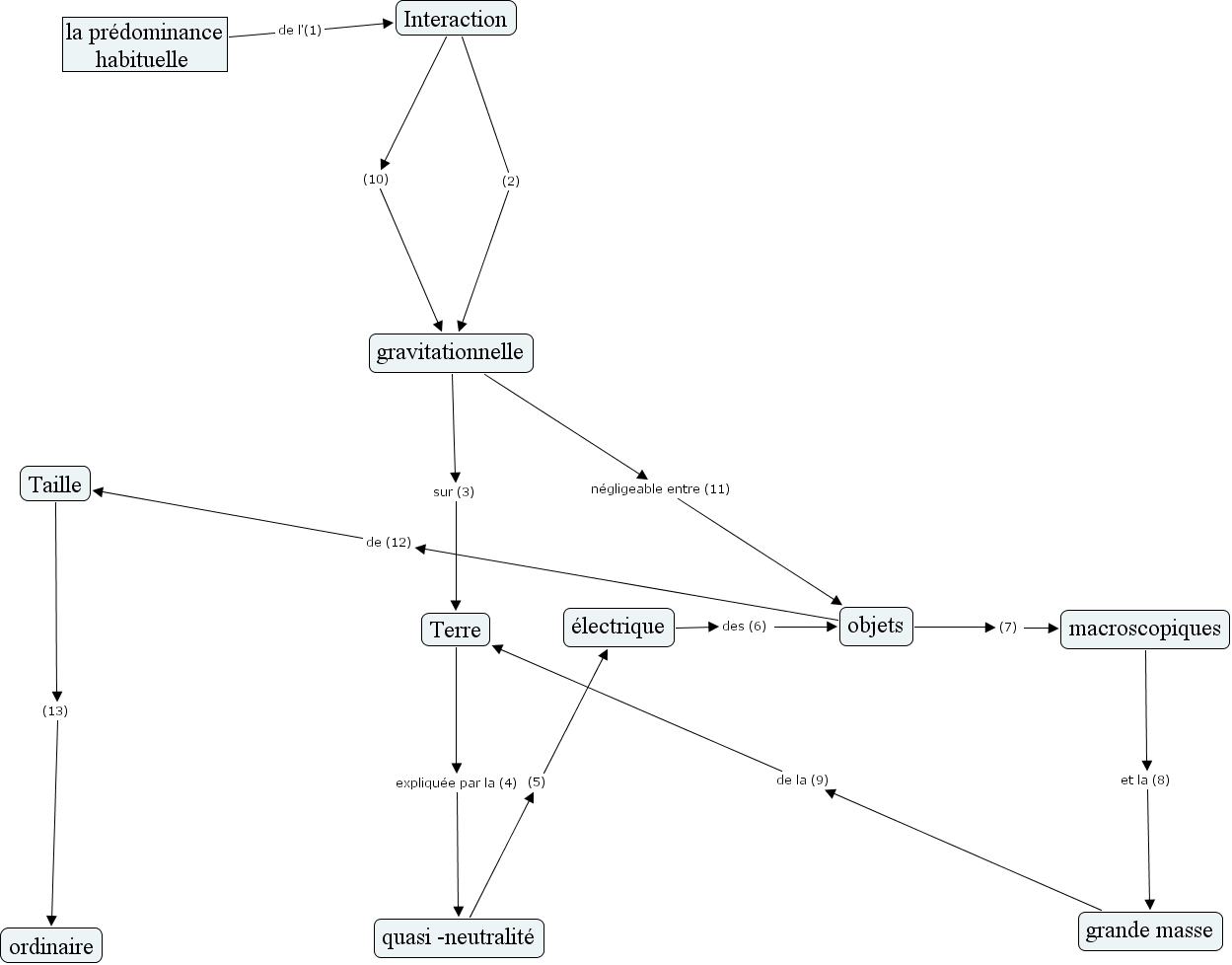 grande masse de la (9) Terre, objets de (12) Taille, gravitationnelle n�gligeable entre (11) objets, Taille (13) ordinaire, objets (7) macroscopiques, quasi -neutralit� (5) �lectrique, macroscopiques et la (8) grande masse, gravitationnelle sur (3) Terre, la pr�dominance habituelle de l'(1) Interaction, Interaction (2) gravitationnelle, Interaction (10) gravitationnelle, Terre expliqu�e par la (4) quasi -neutralit�, �lectrique des (6) objets