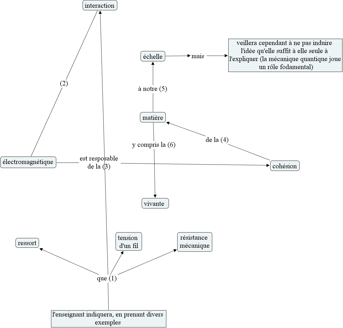 �lectromagn�tique est resposable de la (3) coh�sion, �chelle mais veillera cependant � ne pas induire l'id�e qu'elle suffit � elle seule � l'expliquer (la m�canique quantique joue un r�le fodamental), l'enseignant indiquera, en prenant divers exemples que (1) interaction, l'enseignant indiquera, en prenant divers exemples que (1) r�sistance m�canique, l'enseignant indiquera, en prenant divers exemples que (1) tension d'un fil, l'enseignant indiquera, en prenant divers exemples que (1) ressort, mati�re � notre (5) �chelle, mati�re y compris la (6) vivante, interaction (2) �lectromagn�tique, coh�sion de la (4) mati�re