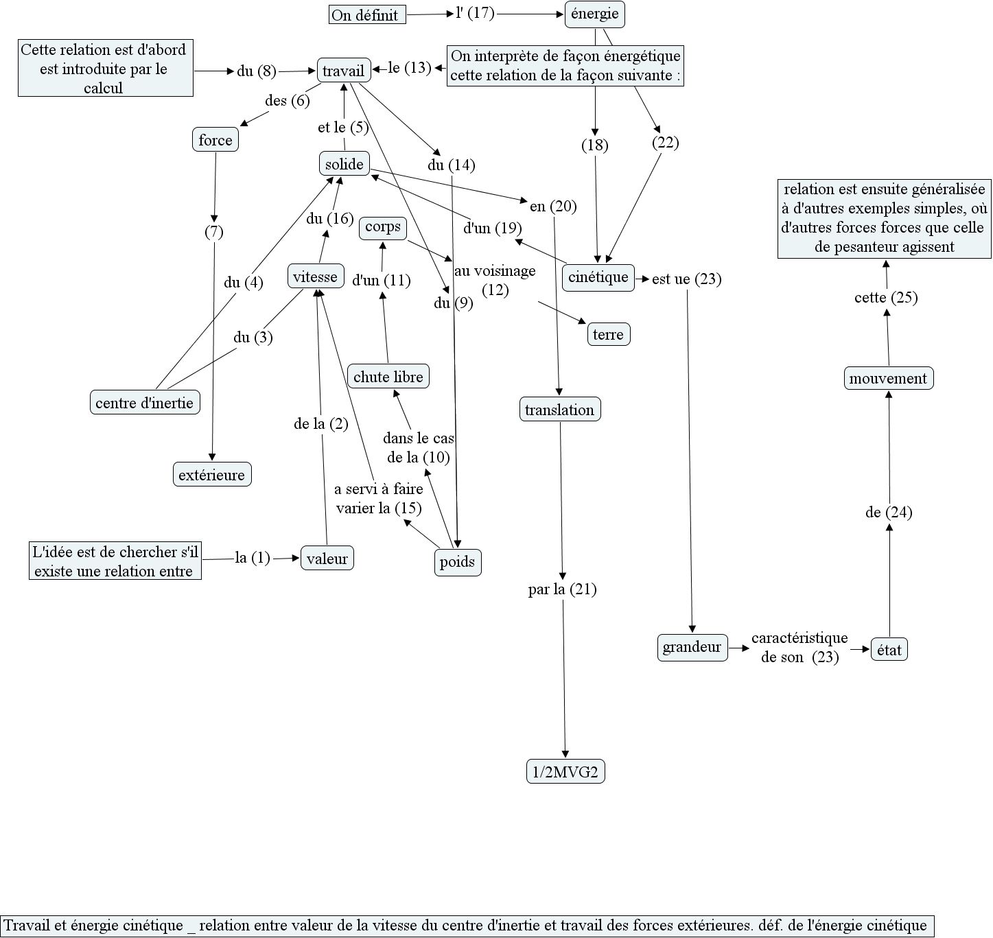 solide et le (5) travail, L'id�e est de chercher s'il existe une relation entre la (1) valeur, On d�finit l' (17) �nergie, �nergie (18) cin�tique, �nergie (22) cin�tique, travail du (14) poids, On interpr�te de fa�on �nerg�tique cette relation de la fa�on suivante : le (13) travail, cin�tique d'un (19) solide, �tat de (24) mouvement, vitesse du (16) solide, Cette relation est d'abord est introduite par le calcul du (8) travail, mouvement cette (25) relation est ensuite g�n�ralis�e � d'autres exemples simples, o� d'autres forces forces que celle de pesanteur agissent, corps au voisinage (12) terre, translation par la (21) 1/2MVG2, travail du (9) poids, vitesse du (3) centre d'inertie, valeur de la (2) vitesse, poids a servi � faire varier la (15) vitesse, grandeur caract�ristique de son (23) �tat, travail des (6) force, cin�tique est ue (23) grandeur, force (7) ext�rieure, chute libre d'un (11) corps, solide en (20) translation, poids dans le cas de la (10) chute libre, centre d'inertie du (4) solide