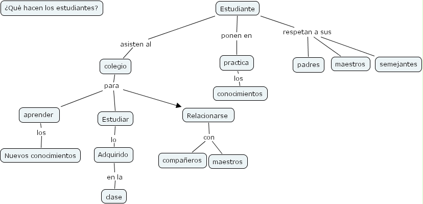colegio para Estudiar, colegio para Relacionarse, colegio para aprender, Estudiante respetan a sus maestros, Estudiante respetan a sus padres, Estudiante respetan a sus semejantes, Estudiante ponen en practica, Estudiante asisten al colegio, aprender los Nuevos conocimientos, Estudiar lo Adquirido, practica los conocimientos, Adquirido en la clase, Relacionarse con maestros, Relacionarse con compa�eros