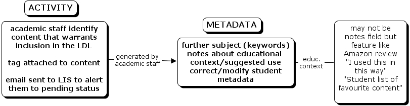 metadata workflow 2 b&w, academic staff identify content that warrants inclusion in the ldl tag attached to content email sent to lis to alert them to pending status, metadata, may not be notes field but feature like amazon review i used this in this way student list of favourite content , activity, further subject (keywords) notes about educational context suggested use correct modify student metadata