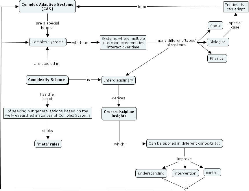 Systems where multiple interconnected entities interact over time many different 'types' of systems Interdisciplinary, Systems where multiple interconnected entities interact over time many different 'types' of systems Biological, Systems where multiple interconnected entities interact over time many different 'types' of systems Social, Systems where multiple interconnected entities interact over time many different 'types' of systems Physical, of seeking out generalisations based on the well-researched instances of Complex Systems seeks 'meta' rules, Entities that can adapt form Complex Adaptive Systems (CAS), Cross-discipline insights which Can be applied in different contexts to:, understanding of Complex Adaptive Systems (CAS), understanding of Complex Systems, Social special case Entities that can adapt, Complexity Science has the aim of of seeking out generalisations based on the well-researched instances of Complex Systems, Complex Systems which are Systems where multiple interconnected entities interact over time, Interdisciplinary derives Cross-discipline insights, Can be applied in different contexts to: improve understanding, Can be applied in different contexts to: improve intervention, Can be applied in different contexts to: improve control, Biological special case Entities that can adapt, 'meta' rules which Can be applied in different contexts to:, intervention of Complex Adaptive Systems (CAS), intervention of Complex Systems, control of Complex Adaptive Systems (CAS), control of Complex Systems, Complexity Science are studied in Complex Systems, Complex Adaptive Systems (CAS) are a special form of Complex Systems, Complexity Science is Interdisciplinary