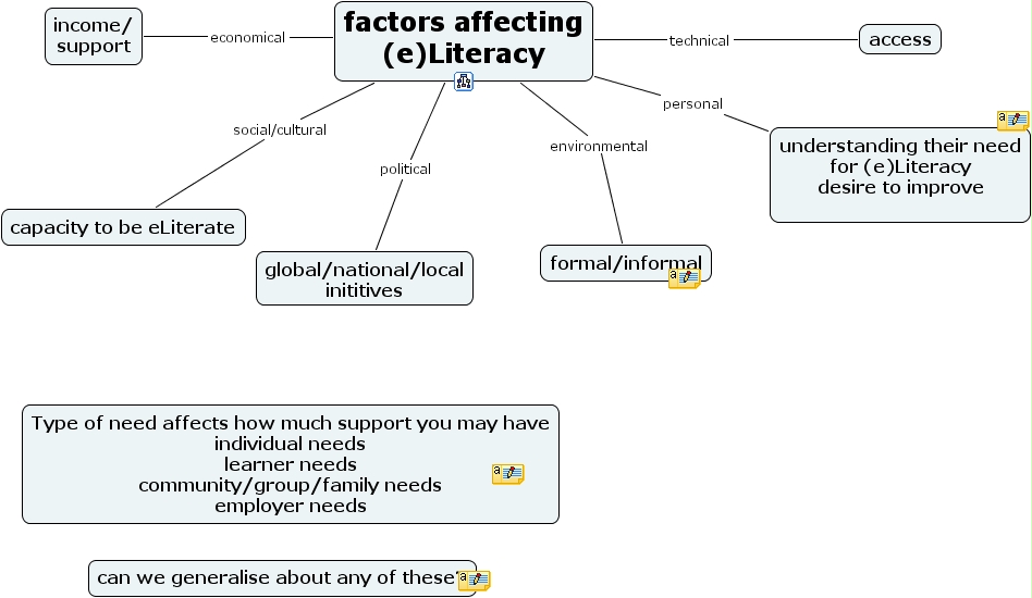 factors affecting (e)Literacy social/cultural capacity to be eLiterate, factors affecting (e)Literacy environmental formal/informal, factors affecting (e)Literacy technical access, factors affecting (e)Literacy political global/national/local inititives, factors affecting (e)Literacy economical income/ support, factors affecting (e)Literacy personal understanding their need for (e)Literacy desire to improve