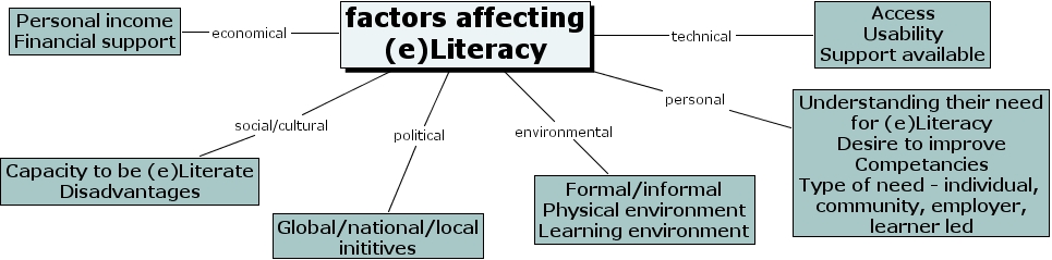 factors affecting (e)Literacy social/cultural Capacity to be (e)Literate Disadvantages, factors affecting (e)Literacy environmental Formal/informal Physical environment Learning environment, factors affecting (e)Literacy political Global/national/local inititives, factors affecting (e)Literacy technical Access Usability Support available, factors affecting (e)Literacy personal Understanding their need for (e)Literacy Desire to improve Competancies Type of need - individual, community, employer, learner led, factors affecting (e)Literacy economical Personal income Financial support