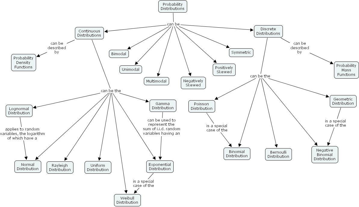 Continuous Distributions can be described by Probability Density Functions, Exponential Distribution is a special case of the Weibull Distribution, Poisson Distribution is a special case of the Binomial Distribution, Discrete Distributions can be described by Probability Mass Functions, Geometric Distribution is a special case of the Negative Binomial Distribution, Continuous Distributions can be the Gamma Distribution, Continuous Distributions can be the Rayleigh Distribution, Continuous Distributions can be the Normal Distribution, Continuous Distributions can be the Weibull Distribution, Continuous Distributions can be the Uniform Distribution, Continuous Distributions can be the Lognormal Distribution, Continuous Distributions can be the Exponential Distribution, Probability Distributions can be Bimodal, Probability Distributions can be Multimodal, Probability Distributions can be Symmetric, Probability Distributions can be Positively Skewed, Probability Distributions can be Unimodal, Probability Distributions can be Discrete Distributions, Probability Distributions can be Negatively Skewed, Probability Distributions can be Continuous Distributions, Gamma Distribution can be used to represent the sum of i.i.d. random variables having an Exponential Distribution, Discrete Distributions can be the Binomial Distribution, Discrete Distributions can be the Bernoulli Distribution, Discrete Distributions can be the Poisson Distribution, Discrete Distributions can be the Geometric Distribution, Discrete Distributions can be the Negative Binomial Distribution, Lognormal Distribution applies to random variables, the logarithm of which have a Normal Distribution