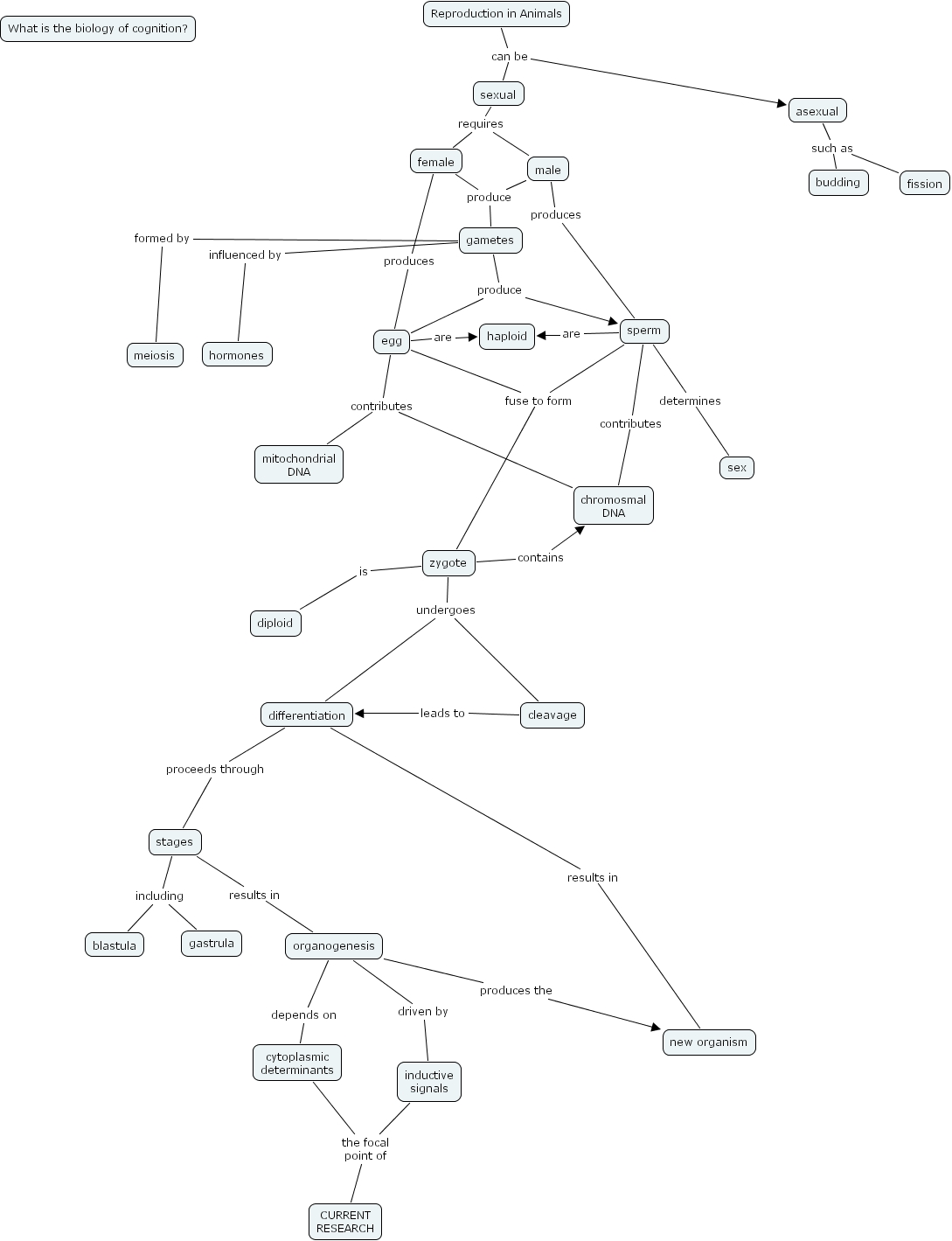 female produces egg, gametes influenced by hormones, sperm are haploid, organogenesis driven by inductive signals, male produces sperm, stages including gastrula, stages including blastula, organogenesis depends on cytoplasmic determinants, zygote is diploid, gametes produce sperm, gametes produce egg, cleavage leads to differentiation, sexual requires male, sexual requires female, organogenesis produces the new organism, Reproduction in Animals can be asexual, Reproduction in Animals can be sexual, stages results in organogenesis, cytoplasmic determinants the focal point of CURRENT RESEARCH, asexual such as budding, asexual such as fission, female produce gametes, male produce gametes, inductive signals the focal point of CURRENT RESEARCH, egg contributes chromosmal DNA, egg contributes mitochondrial DNA, egg are haploid, sperm determines sex, gametes formed by meiosis, zygote contains chromosmal DNA, differentiation results in new organism, sperm contributes chromosmal DNA, differentiation proceeds through stages, zygote undergoes cleavage, zygote undergoes differentiation, sperm fuse to form zygote, egg fuse to form zygote