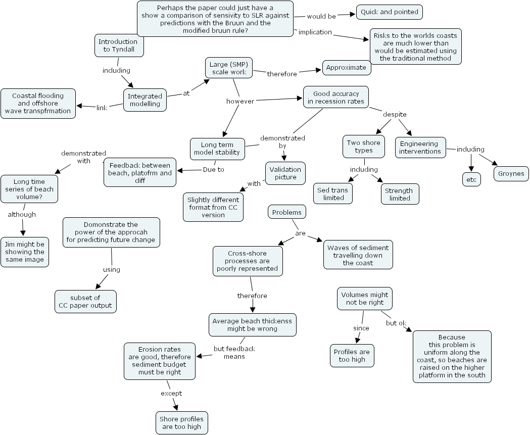 Perhaps the paper could just have a show a comparison of sensivity to SLR against predictions with the Bruun and the modified bruun rule? implication Risks to the worlds coasts are much lower than would be estimated using the traditional method, Large (SMP) scale work therefore Approximate, Volumes might not be right since Profiles are too high, Good accuracy in recession rates despite Two shore types, Good accuracy in recession rates despite Engineering interventions, Long term model stability demonstrated by Validation picture, Erosion rates are good, therefore sediment budget must be right except Shore profiles are too high, Introduction to Tyndall including Integrated modelling, Feedback between beach, platofrm and cliff demonstrated with Long time series of beach volume?, Problems are Waves of sediment travelling down the coast, Problems are Cross-shore processes are poorly represented, Engineering interventions including Groynes, Engineering interventions including etc, Average beach thickenss might be wrong but feedback means Erosion rates are good, therefore sediment budget must be right, Cross-shore processes are poorly represented therefore Average beach thickenss might be wrong, Good accuracy in recession rates demonstrated by Validation picture, Integrated modelling link Coastal flooding and offshore wave transpfrmation, Volumes might not be right but ok Because this problem is uniform along the coast, so beaches are raised on the higher platform in the south, Integrated modelling at Large (SMP) scale work, Perhaps the paper could just have a show a comparison of sensivity to SLR against predictions with the Bruun and the modified bruun rule? would be Quick and pointed, Long term model stability Due to Feedback between beach, platofrm and cliff, Long time series of beach volume? although Jim might be showing the same image, Validation picture with Slightly different format from CC version, Domonstrate the power of the approcah for predicting future change using subset of CC paper output, Large (SMP) scale work however Good accuracy in recession rates, Large (SMP) scale work however Long term model stability, Two shore types including Strength limited, Two shore types including Sed trans limited