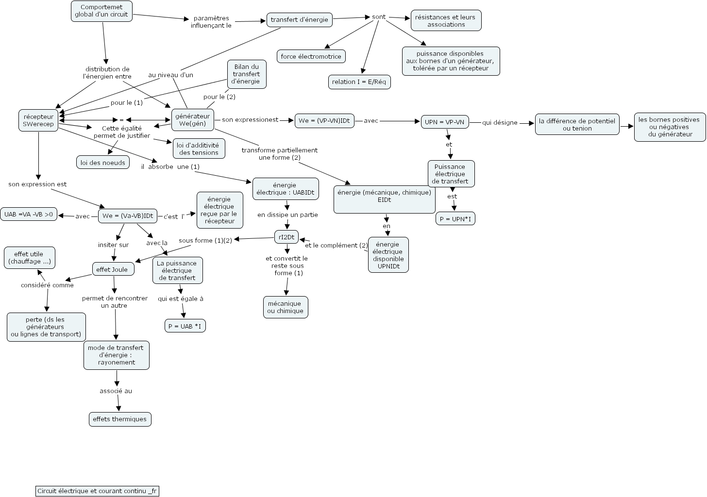 rI2Dt et convertit le reste sous forme (1) m�canique ou chimique, r�cepteur SWerecep Cette �galit� permet de justifier loi des noeuds, r�cepteur SWerecep Cette �galit� permet de justifier loi d'additivit� des tensions, la diff�rence de potentiel ou tenion entre les les bornes positives ou n�gatives du g�n�rateur, UPN = VP-VN qui d�signe la diff�rence de potentiel ou tenion, Puissance �lectrique de transfert est P = UPN*I, �nergie �lectrique disponible UPNIDt et le compl�ment (2) rI2Dt, mode de transfert d'�nergie : rayonement associ� au effets thermiques, We = (Va-VB)IDt c'est l' �nergie �lectrique re�ue par le r�cepteur, We = (Va-VB)IDt avec la La puissance �lectrique de transfert, r�cepteur SWerecep il absorbe une (1) �nergie �lectrique : UABIDt, transfert d'�nergie au niveau d'un g�n�rateur We(g�n), transfert d'�nergie au niveau d'un r�cepteur SWerecep, Comportemet global d'un circuit param�tres influen�ant le transfert d'�nergie, Bilan du transfert d'�nergie pour le (1) r�cepteur SWerecep, �nergie �lectrique : UABIDt en dissipe un partie rI2Dt, rI2Dt sous forme (1)(2) effet Joule, g�n�rateur We(g�n) transforme partiellement une forme (2) �nergie (m�canique, chimique) EIDt, We = (VP-VN)IDt avec UPN = VP-VN, g�n�rateur We(g�n) = r�cepteur SWerecep, Bilan du transfert d'�nergie pour le (2) g�n�rateur We(g�n), We = (Va-VB)IDt avec UAB =VA -VB >0, effet Joule permet de rencontrer un autre mode de transfert d'�nergie : rayonement, Comportemet global d'un circuit distribution de l'�nergien entre g�n�rateur We(g�n), Comportemet global d'un circuit distribution de l'�nergien entre r�cepteur SWerecep, r�cepteur SWerecep son expression est We = (Va-VB)IDt, We = (Va-VB)IDt insiter sur effet Joule, g�n�rateur We(g�n) son expressionest We = (VP-VN)IDt, UPN = VP-VN et Puissance �lectrique de transfert, g�n�rateur We(g�n) Cette �galit� permet de justifier loi des noeuds, g�n�rateur We(g�n) Cette �galit� permet de justifier loi d'additivit� des tensions, effet Joule consid�r� comme perte (ds les g�n�rateurs ou lignes de transport), effet Joule consid�r� comme effet utile (chauffage ...), transfert d'�nergie sont puissance disponibles aux bornes d'un g�n�rateur, tol�r�e par un r�cepteur, transfert d'�nergie sont force �lectromotrice, transfert d'�nergie sont relation I = E/R�q, transfert d'�nergie sont r�sistances et leurs associations, La puissance �lectrique de transfert qui est �gale � P = UAB *I, �nergie (m�canique, chimique) EIDt en �nergie �lectrique disponible UPNIDt