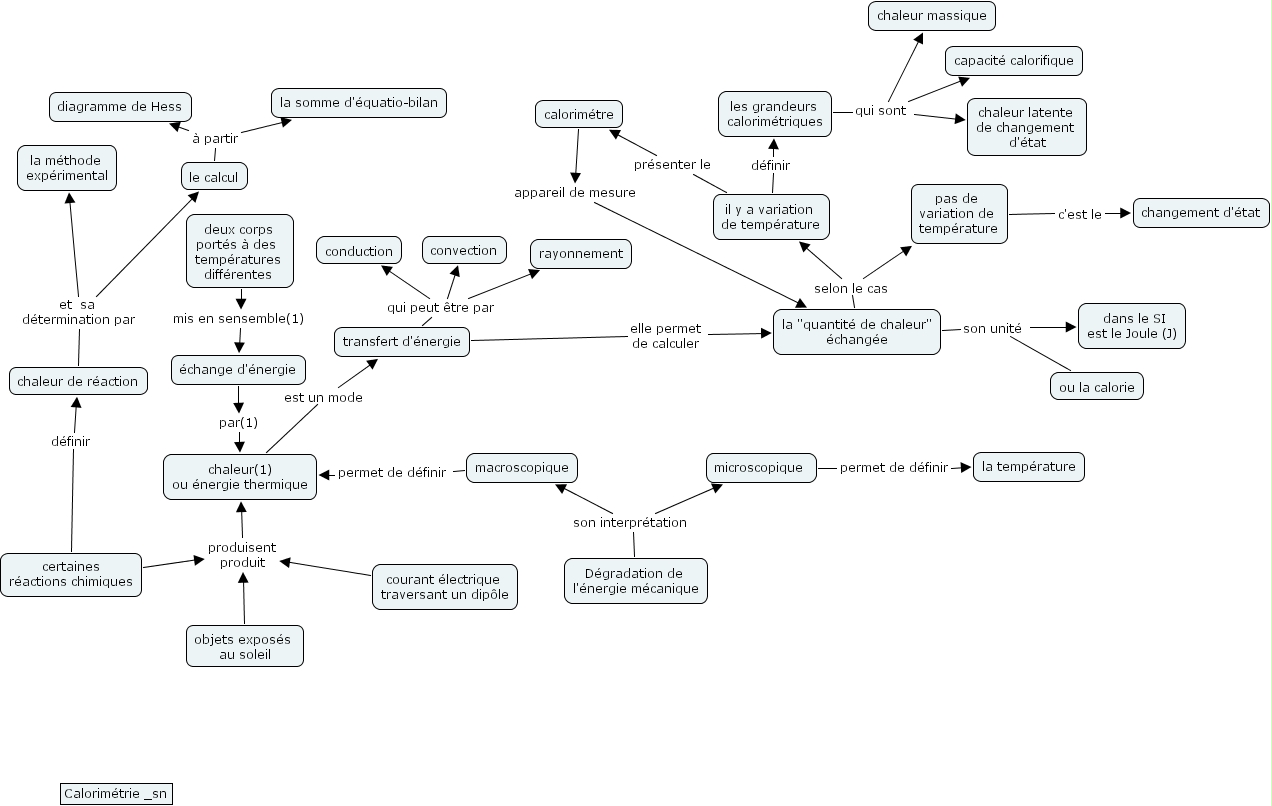 transfert d'�nergie elle permet de calculer la "quantit� de chaleur" �chang�e, chaleur de r�action et sa d�termination par le calcul, chaleur de r�action et sa d�termination par la m�thode exp�rimental, la "quantit� de chaleur" �chang�e selon le cas il y a variation de temp�rature, la "quantit� de chaleur" �chang�e selon le cas pas de variation de temp�rature, chaleur(1) ou �nergie thermique est un mode transfert d'�nergie, calorim�tre appareil de mesure la "quantit� de chaleur" �chang�e, il y a variation de temp�rature pr�senter le calorim�tre, les grandeurs calorim�triques qui sont chaleur latente de changement d'�tat, les grandeurs calorim�triques qui sont capacit� calorifique, les grandeurs calorim�triques qui sont chaleur massique, courant �lectrique traversant un dip�le produisent produit chaleur(1) ou �nergie thermique, la "quantit� de chaleur" �chang�e son unit� ou la calorie, la "quantit� de chaleur" �chang�e son unit� dans le SI est le Joule (J), deux corps port�s � des temp�ratures diff�rentes mis en sensemble(1) �change d'�nergie, pas de variation de temp�rature c'est le changement d'�tat, microscopique permet de d�finir la temp�rature, certaines r�actions chimiques produisent produit chaleur(1) ou �nergie thermique, transfert d'�nergie qui peut �tre par conduction, transfert d'�nergie qui peut �tre par rayonnement, transfert d'�nergie qui peut �tre par convection, objets expos�s au soleil produisent produit chaleur(1) ou �nergie thermique, macroscopique permet de d�finir chaleur(1) ou �nergie thermique, il y a variation de temp�rature d�finir les grandeurs calorim�triques, certaines r�actions chimiques d�finir chaleur de r�action, �change d'�nergie par(1) chaleur(1) ou �nergie thermique, D�gradation de l'�nergie m�canique son interpr�tation macroscopique, D�gradation de l'�nergie m�canique son interpr�tation microscopique, le calcul � partir la somme d'�quatio-bilan, le calcul � partir diagramme de Hess