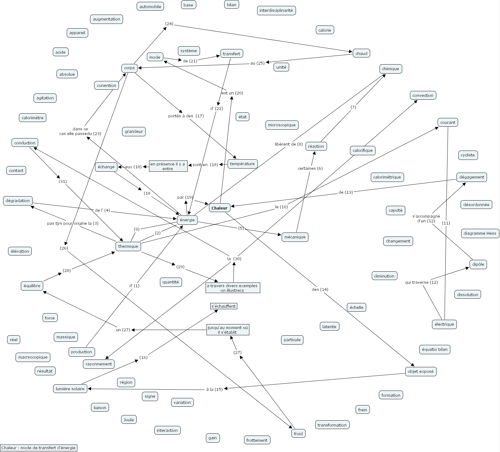 �nergie (9) thermique, r�action (7) chimique, �quilibre (28) thermique, corps (26) froid, transfert d' (22) �nergie, �change (18 �nergie, �nergie (5) m�canique, temp�rature sont en (18) en pr�sence il y a entre, thermique pas tjrs pour origine la (3) d�gradation, Chaleur est un (20) mode, dip�le s'accompagne d'un (12) d�gagement, courant (11) �lectrique, production d' (1) �nergie, thermique (29) a travers divers exemples on illustrera, mode de (21) transfert, m�canique certaines (6) r�action, froid (27) jusqu'au moment o� il s'�tablit, corps (24) chaud, corps port�s � des (17) temp�rature, chaud au (25) corps, a travers divers exemples on illustrera la (30) conduction, a travers divers exemples on illustrera la (30) rayonnement, a travers divers exemples on illustrera la (30) convection, Chaleur des (14) objet expos�, thermique le (10) courant, en pr�sence il y a entre eux (18) �change, conduction (31) thermique, �nergie (2) thermique, d�gradation de l' (4) �nergie, lumi�re solaire (16) s'�chauffent, objet expos� � la (15) lumi�re solaire, jusqu'au moment o� il s'�tablit un (27) �quilibre, �nergie dans ce cas elle passedu (23) corps, chimique lib�rent de (8) �nergie, �lectrique qui traverse (12) dip�le, d�gagement de (13) Chaleur, �nergie par (19) Chaleur