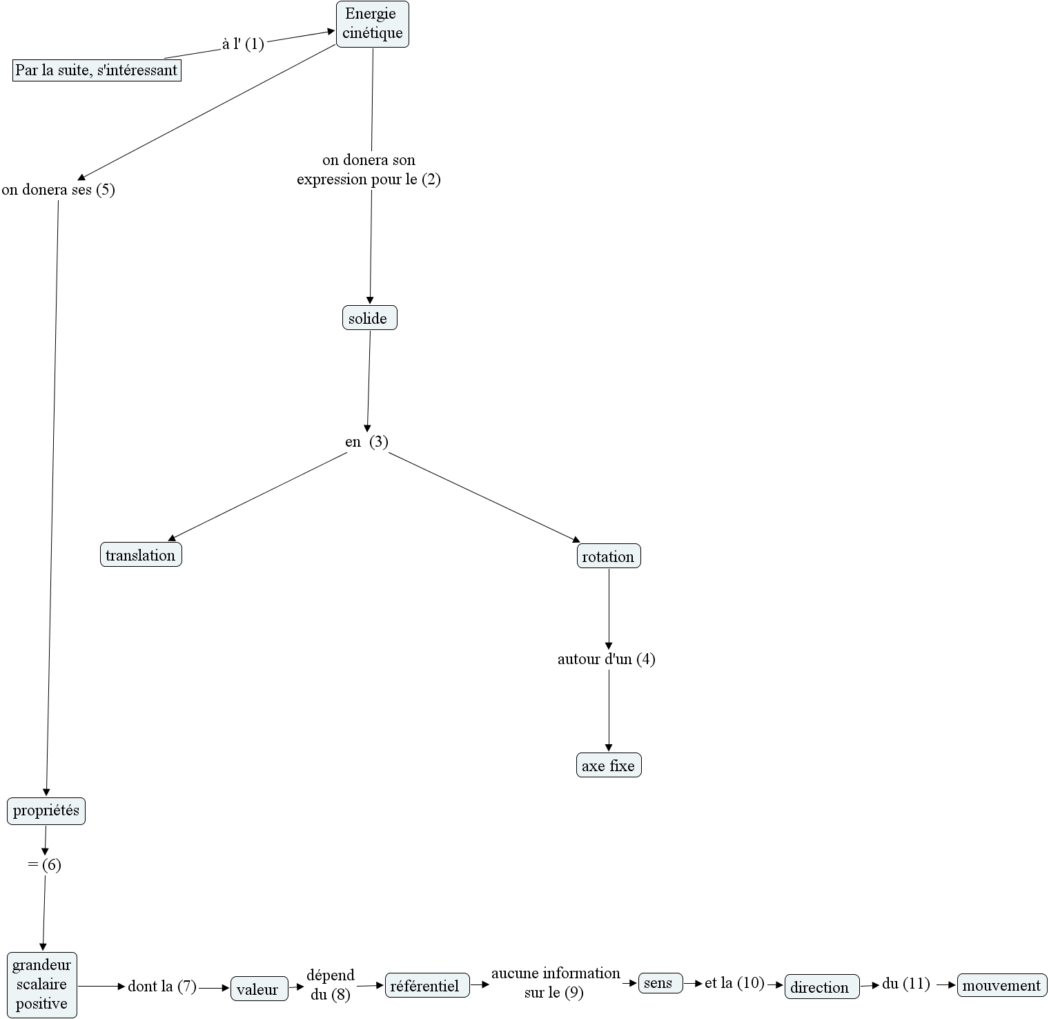 solide en (3) rotation, solide en (3) translation, sens et la (10) direction, grandeur scalaire positive dont la (7) valeur, Energie cin�tique on donera son expression pour le (2) solide, valeur d�pend du (8) r�f�rentiel, r�f�rentiel aucune information sur le (9) sens, propri�t�s = (6) grandeur scalaire positive, direction du (11) mouvement, rotation autour d'un (4) axe fixe, Par la suite, s'int�ressant � l' (1) Energie cin�tique, Energie cin�tique on donera ses (5) propri�t�s