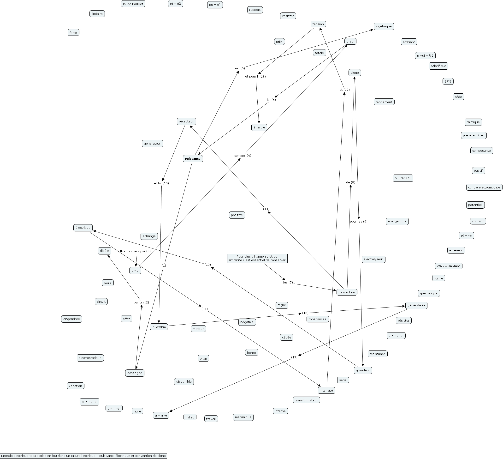 convention de (8) signe, dip�le s'xprimera par (3) p =ui, intensit� et (12) tension, puissance est (6) alg�brique, signe pour les (9) grandeur, tension et pour l' (13) �nergie, g�n�ralis�e (17) u = ri -e, convention (14) r�cepteur, Pour plus d'harmonie et de simplicit� il est essentiel de conserver les (7) convention, grandeur (10) �lectrique, p =ui comme (4) u et i, �chang�e par un (2) dip�le, u et i la (5) puissance, puissance (1) �chang�e, r�cepteur et la (15) loi d'Ohm, �lectrique (11) intensit�, loi d'Ohm (16) g�n�ralis�e