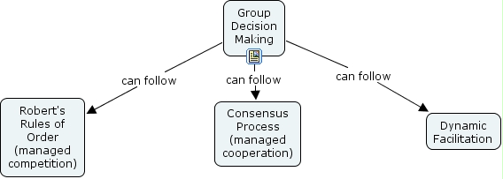Group Decision Making can follow Dynamic Facilitation, Group Decision Making can follow Consensus Process (managed cooperation), Group Decision Making can follow Robert's Rules of Order (managed competition)