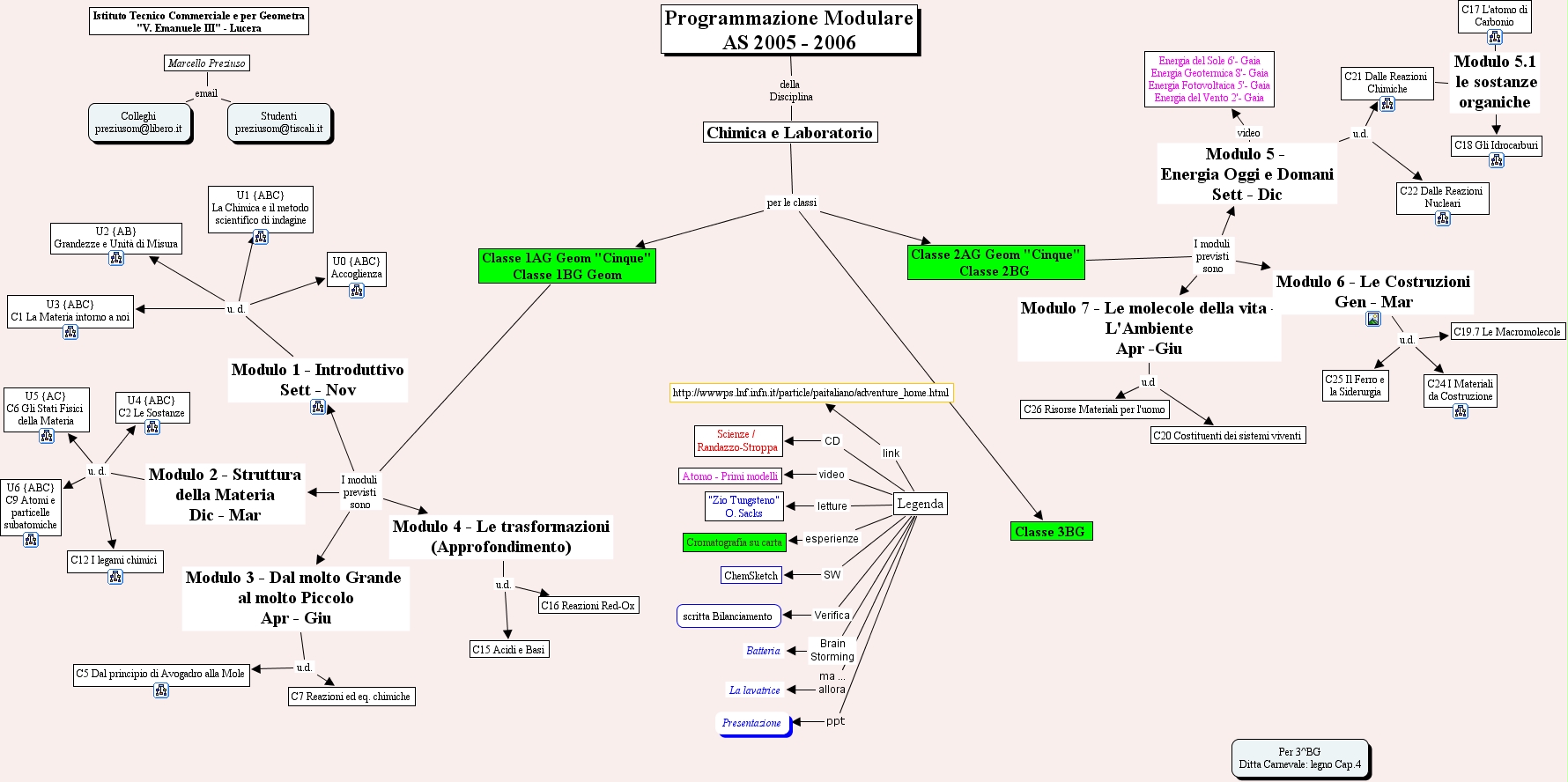 Moduli x Corsi Geometra e 5, Classe 1AG Geom "Cinque" Classe 1BG Geom I moduli previsti sono Modulo 2 - Struttura della Materia Dic - Mar, C21 Dalle Reazioni Chimiche Modulo 5.1 le sostanze organiche C17 L'atomo di Carbonio, Modulo 7 - Le molecole della vita - L'Ambiente Apr -Giu u.d C26 Risorse Materiali per l'uomo, Modulo 5 - Energia Oggi e Domani Sett - Dic u.d. C21 Dalle Reazioni Chimiche, Modulo 2 - Struttura della Materia Dic - Mar u. d. U4 {ABC} C2 Le Sostanze, Modulo 2 - Struttura della Materia Dic - Mar u. d. C12 I legami chimici, Chimica e Laboratorio per le classi Classe 1AG Geom "Cinque" Classe 1BG Geom, Modulo 2 - Struttura della Materia Dic - Mar u. d. U6 {ABC} C9 Atomi e particelle subatomiche, Chimica e Laboratorio per le classi Classe 3BG, Modulo 3 - Dal molto Grande al molto Piccolo Apr - Giu u.d. C7 Reazioni ed eq. chimiche