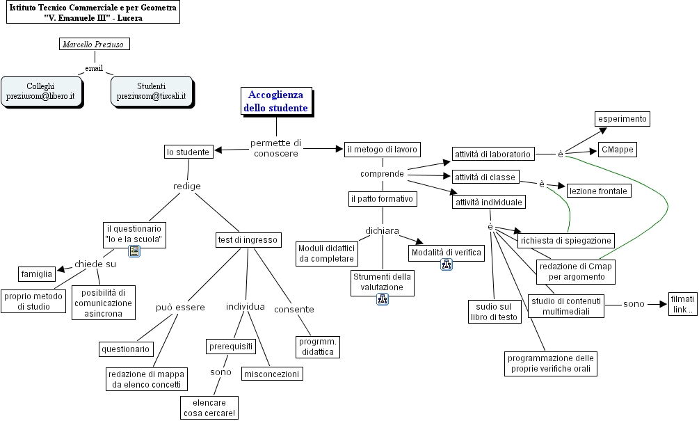 test di ingresso individua misconcezioni, test di ingresso individua prerequisiti, test di ingresso pu� essere questionario, test di ingresso pu� essere redazione di mappa da elenco concetti, il questionario "Io e la scuola" chiede su proprio metodo di studio, il questionario "Io e la scuola" chiede su famiglia, il questionario "Io e la scuola" chiede su posibilit� di comunicazione asincrona, attivit� individuale � studio di contenuti multimediali, attivit� individuale � programmazione delle proprie verifiche orali, attivit� individuale � sudio sul libro di testo, attivit� individuale � richiesta di spiegazione, attivit� individuale � redazione di Cmap per argomento, test di ingresso consente progrmm. didattica, studio di contenuti multimediali sono filmati link .., Marcello Preziuso email Colleghi preziusom@libero.it, Marcello Preziuso email Studenti preziusom@tiscali.it, Accoglienza dello studente permette di conoscere lo studente, Accoglienza dello studente permette di conoscere il metogo di lavoro, lo studente redige il questionario "Io e la scuola", lo studente redige test di ingresso, il patto formativo dichiara Modalit� di verifica, il patto formativo dichiara Moduli didattici da completare, il patto formativo dichiara Strumenti della valutazione, prerequisiti sono elencare cosa cercare!, il metogo di lavoro comprende il patto formativo, il metogo di lavoro comprende attivit� di classe, il metogo di lavoro comprende attivit� di laboratorio, il metogo di lavoro comprende attivit� individuale, attivit� di classe � lezione frontale, attivit� di classe � richiesta di spiegazione, attivit� di laboratorio � CMappe, attivit� di laboratorio � redazione di Cmap per argomento, attivit� di laboratorio � esperimento