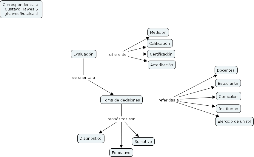 Evaluaci�n difiere de Acreditaci�n, Evaluaci�n difiere de Medici�n, Evaluaci�n difiere de Calificaci�n, Evaluaci�n difiere de Certificaci�n, Evaluaci�n se orienta a Toma de decisiones, Toma de decisiones prop�sitos son Diagn�stico, Toma de decisiones prop�sitos son Formativo, Toma de decisiones prop�sitos son Sumativo, Toma de decisiones referidas a Institucion, Toma de decisiones referidas a Docentes, Toma de decisiones referidas a Curriculum, Toma de decisiones referidas a Estudiante, Toma de decisiones referidas a Ejercicio de un rol
