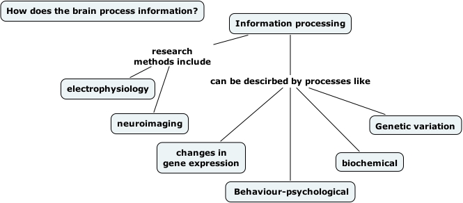 Information processing research methods include neuroimaging,Information processing can be descirbed by processes like Behaviour-psychological,Information processing can be descirbed by processes like changes in gene expression,Information processing research methods include electrophysiology,Information processing can be descirbed by processes like Genetic variation,Information processing can be descirbed by processes like biochemical
