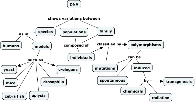 individuals classified by polymorphisms,models such as yeast,models such as mice,populations composed of individuals,models such as zebra fish,models such as drosophila,induced by radiation,individuals classified by mutations,DNA shows variations between family,induced by transgenesis,species as in models,polymorphisms can be induced,induced by chemicals,DNA shows variations between populations,DNA shows variations between species,models such as aplysia,mutations can be spontaneous,family composed of individuals,mutations can be induced,species as in humans,models such as c-elegans,polymorphisms can be spontaneous