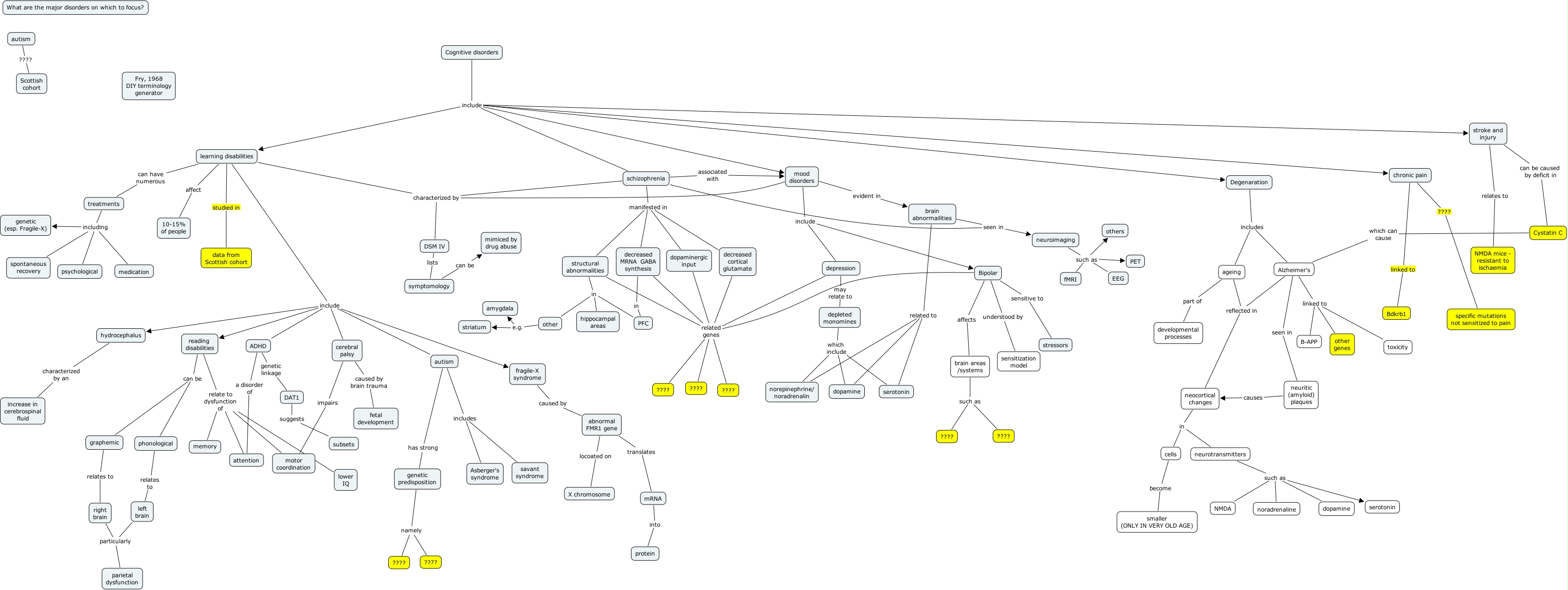 brain abnormailities related to dopamine,other e.g. amygdala,neuroimaging such as others,ADHD genetic linkage DAT1,neurotransmitters such as serotonin,Bipolar sensitive to stressors,treatments including spontaneous recovery,structural abnormalities related genes ????,mood disorders include Bipolar,neuroimaging such as PET,Bipolar related genes ????,Cognitive disorders include stroke and injury,learning disabilities include cerebral palsy,Bipolar related genes ????,hydrocephalus characterized by an increase in cerebrospinal fluid,neuroimaging such as EEG,learning disabilities can have numerous treatments,decreased MRNA GABA synthesis related genes ????,schizophrenia manifested in decreased cortical glutamate,Cognitive disorders include Degenaration,stroke and injury relates to NMDA mice - resistant to ischaemia,treatments including psychological,genetic predisposition namely ????,mRNA into protein,mood disorders evident in brain abnormailities,phonological relates to left brain,decreased MRNA GABA synthesis related genes ????,mood disorders include depression,Degenaration includes Alzheimer's,dopaminergic input related genes ????,Cognitive disorders include mood disorders,Bipolar affects brain areas /systems,graphemic relates to right brain,schizophrenia manifested in dopaminergic input,reading disabilities relate to dysfunction of motor coordination,neuritic (amyloid) plaques causes neocortical changes,autism includes savant syndrome,abnormal FMR1 gene locoated on X chromosome,Degenaration includes ageing,dopaminergic input related genes ????,decreased MRNA GABA synthesis in PFC,brain abnormailities related to norepinephrine/ noradrenalin,structural abnormalities in hippocampal areas,DAT1 suggests subsets,brain areas /systems such as ????,neurotransmitters such as dopamine,genetic predisposition namely ????,neurotransmitters such as noradrenaline,Cognitive disorders include learning disabilities,cerebral palsy impairs motor coordination,decreased cortical glutamate related genes ????,decreased cortical glutamate related genes ????,schizophrenia associated with mood disorders,cells become smaller (ONLY IN VERY OLD AGE),neurotransmitters such as NMDA,chronic pain ???? specific mutations not sensitized to pain,learning disabilities include fragile-X syndrome,schizophrenia manifested in structural abnormalities,Cystatin C which can cause Alzheimer's,reading disabilities can be phonological,chronic pain linked to Bdkrb1,Bipolar related genes ????,structural abnormalities related genes ????,schizophrenia manifested in decreased MRNA GABA synthesis,stroke and injury can be caused by deficit in Cystatin C,Alzheimer's reflected in neocortical changes,Cognitive disorders include chronic pain,mood disorders characterized by DSM IV,learning disabilities studied in data from Scottish cohort,depleted monomines which include dopamine,depression related genes ????,autism has strong genetic predisposition,DSM IV lists symptomology,learning disabilities characterized by DSM IV,reading disabilities relate to dysfunction of lower IQ,dopaminergic input related genes ????,Alzheimer's linked to other genes,decreased MRNA GABA synthesis related genes ????,learning disabilities affect 10-15% of people,Alzheimer's linked to toxicity,neuroimaging such as fMRI,treatments including medication,Alzheimer's seen in neuritic (amyloid) plaques,Cognitive disorders include schizophrenia,treatments including genetic (esp. Fragile-X),other e.g. striatum,abnormal FMR1 gene translates mRNA,depression related genes ????,learning disabilities include autism,right brain particularly parietal dysfunction,decreased cortical glutamate related genes ????,autism ???? Scottish cohort,left brain particularly parietal dysfunction,brain abnormailities related to serotonin,schizophrenia characterized by DSM IV,neocortical changes in neurotransmitters,autism includes Asberger's syndrome,depression related genes ????,structural abnormalities in other,brain areas /systems such as ????,learning disabilities include reading disabilities,depleted monomines which include norepinephrine/ noradrenalin,learning disabilities include ADHD,reading disabilities relate to dysfunction of attention,ADHD a disorder of attention,cerebral palsy caused by brain trauma fetal development,fragile-X syndrome caused by abnormal FMR1 gene,depression may relate to depleted monomines,depleted monomines which include serotonin,Bipolar understood by sensitization model,Alzheimer's linked to B-APP,symptomology can be mimiced by drug abuse,brain abnormailities seen in neuroimaging,schizophrenia seen in neuroimaging,structural abnormalities in PFC,ageing part of developmental processes,structural abnormalities related genes ????,reading disabilities can be graphemic,learning disabilities include hydrocephalus,ageing reflected in neocortical changes,neocortical changes in cells,reading disabilities relate to dysfunction of memory