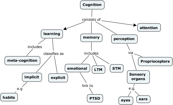 Cognition JDN revision, Cognition consists of attention, perception via Sensory organs, memory includes LTM, Cognition consists of learning, learning classifies as explicit, learning classifies as implicit, learning includes meta-cognition, memory includes STM, Cognition consists of perception, implicit e.g habits