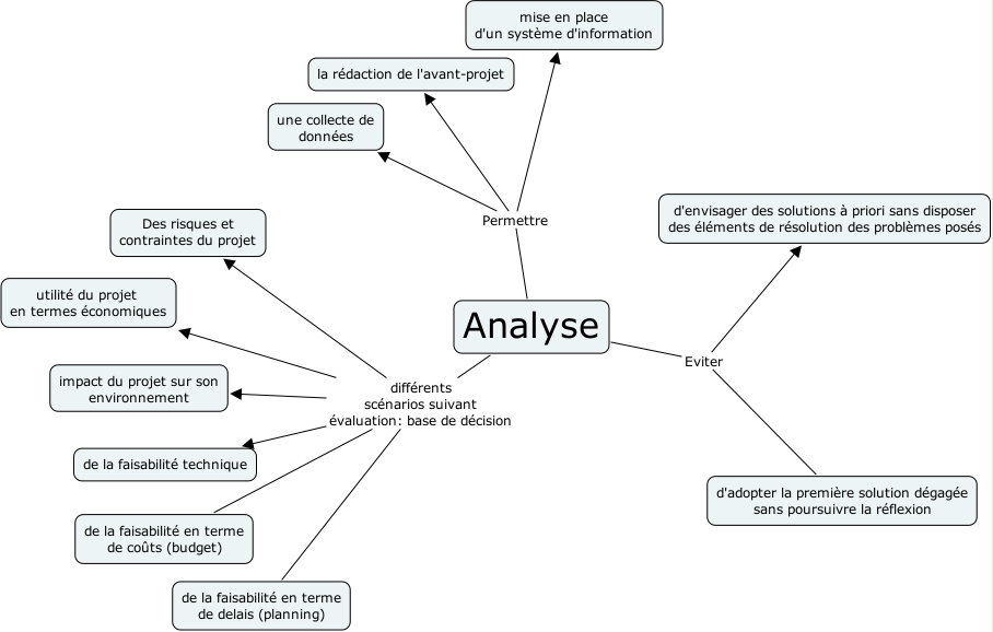Analyse diff�rents sc�narios suivant �valuation: base de d�cision de la faisabilit� en terme de co�ts (budget), Analyse diff�rents sc�narios suivant �valuation: base de d�cision Des risques et contraintes du projet, Analyse diff�rents sc�narios suivant �valuation: base de d�cision utilit� du projet en termes �conomiques, Analyse diff�rents sc�narios suivant �valuation: base de d�cision de la faisabilit� technique, Analyse diff�rents sc�narios suivant �valuation: base de d�cision impact du projet sur son environnement, Analyse diff�rents sc�narios suivant �valuation: base de d�cision de la faisabilit� en terme de delais (planning), Analyse Permettre une collecte de donn�es, Analyse Permettre mise en place d'un syst�me d'information, Analyse Permettre la r�daction de l'avant-projet, Analyse Eviter d'envisager des solutions � priori sans disposer des �l�ments de r�solution des probl�mes pos�s, Analyse Eviter d'adopter la premi�re solution d�gag�e sans poursuivre la r�flexion