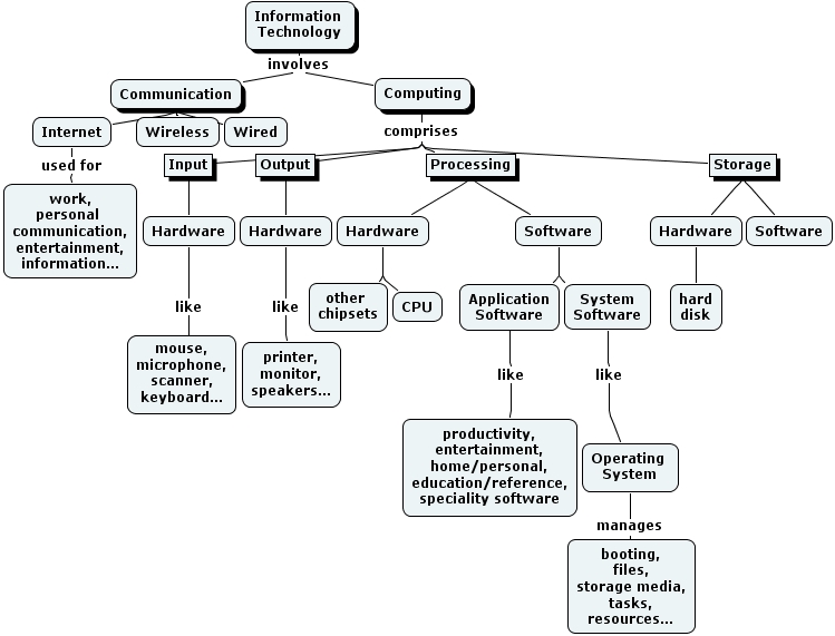 it-rev, communication, wireless, other chipsets, information technology, productivity, entertainment, home personal, education reference, speciality software, computing, software, work, personal communication, entertainment, information..., software, wired, processing, system software, hardware, output, printer, monitor, speakers..., storage, cpu, internet, operating system, hardware, hardware, input, application software, booting, files, storage media, tasks, resources..., hardware, mouse, microphone, scanner, keyboard..., hard disk