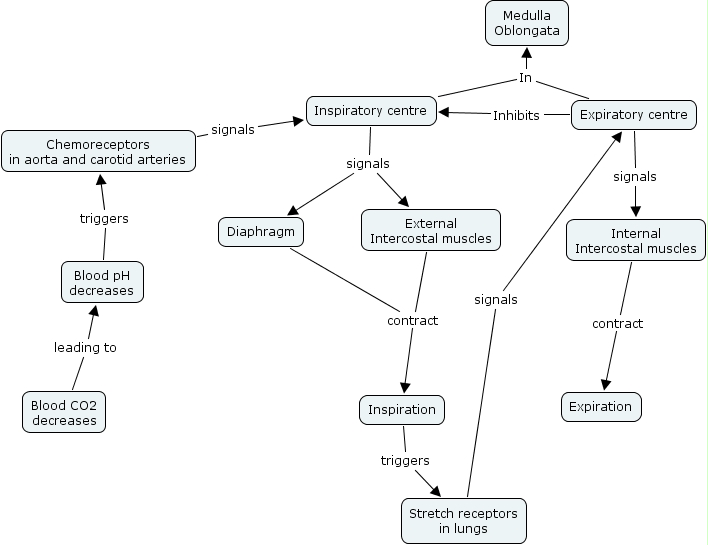 Ventilation_tom_k, External Intercostal muscles contract Inspiration, Blood CO2 decreases leading to Blood pH decreases, Expiratory centre signals Internal Intercostal muscles, Chemoreceptors in aorta and carotid arteries signals Inspiratory centre, Expiratory centre In Medulla Oblongata, Stretch receptors in lungs signals Expiratory centre, Expiratory centre Inhibits Inspiratory centre, Blood pH decreases triggers Chemoreceptors in aorta and carotid arteries, Internal Intercostal muscles contract Expiration, Inspiratory centre signals Diaphragm
