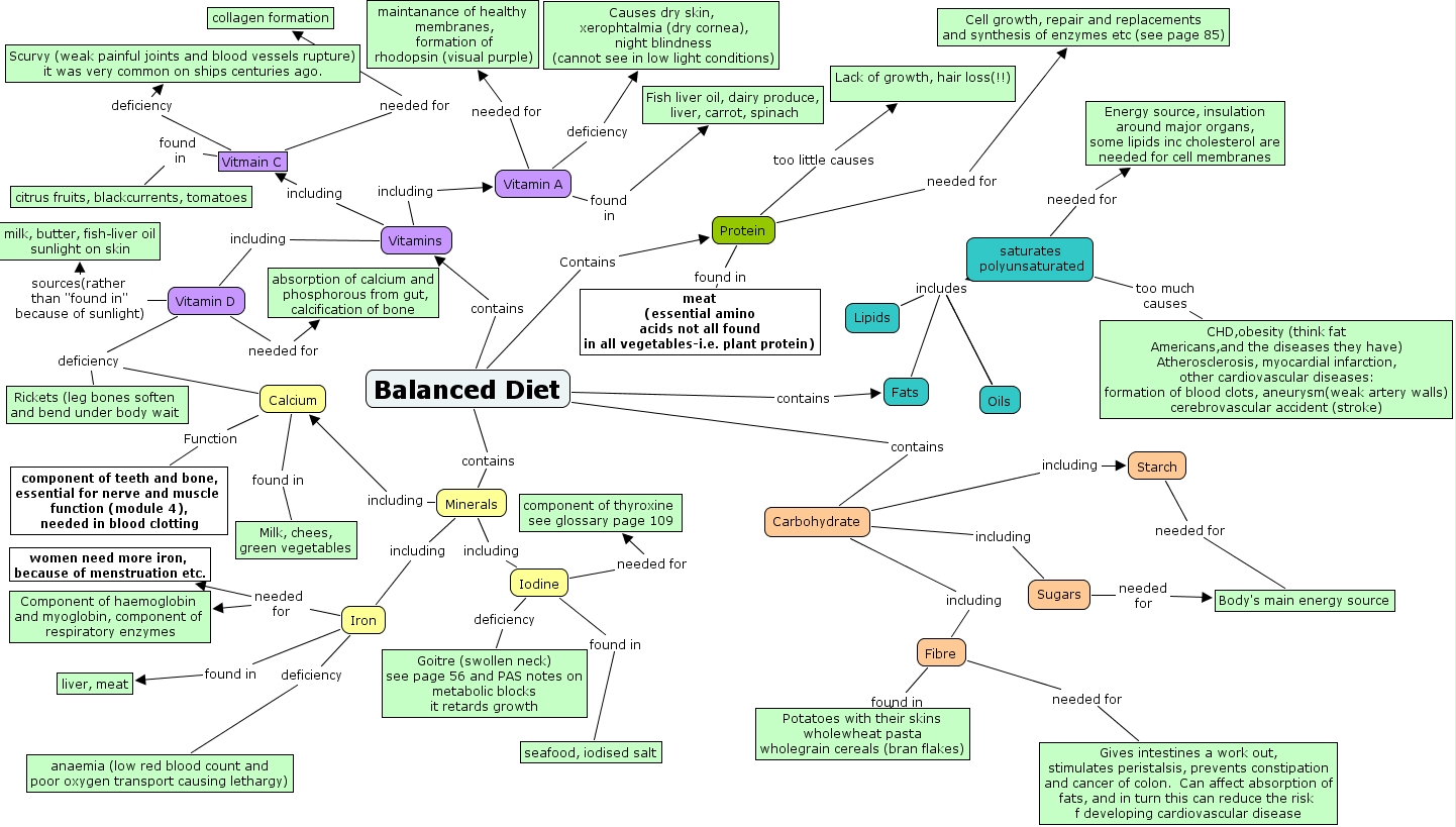Balanced_diet_dooley, Vitamin D sources(rather than "found in" because of sunlight) milk, butter, fish-liver oil sunlight on skin, Vitmain C deficiency Scurvy (weak painful joints and blood vessels rupture) it was very common on ships centuries ago., saturates polyunsaturated needed for Energy source, insulation around major organs, some lipids inc cholesterol are needed for cell membranes, Vitamins including Vitamin D, Balanced Diet contains Vitamins, Calcium Function component of teeth and bone, essential for nerve and muscle function (module 4), needed in blood clotting, Fibre needed for Gives intestines a work out, stimulates peristalsis, prevents constipation and cancer of colon. Can affect absorption of fats, and in turn this can reduce the risk f developing cardiovascular disease, Balanced Diet Contains Protein, Protein found in meat (essential amino acids not all found in all vegetables-i.e. plant protein), Vitamins including Vitmain C