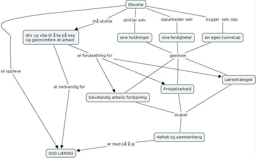 Ungdomsskoleelever, sine ferdigheter gjennom Prosjektarbeid, Elevene utvikler selv sine holdninger, Prosjektarbeid skaper Helhet og sammenheng, Elevene vil oppleve GOD LÆRING, driv og vilje til å ta på seg og gjennomføre et arbeid er forutsetning for Lærestrategier, driv og vilje til å ta på seg og gjennomføre et arbeid er forutsetning for Selvstendig arbeid; fordypning, sin egen kunnskap gjennom Prosjektarbeid, Lærestrategier skaper Helhet og sammenheng, Selvstendig arbeid; fordypning skaper Helhet og sammenheng, sine ferdigheter gjennom Selvstendig arbeid; fordypning