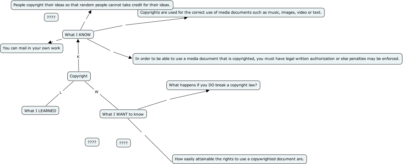 CopyrightKWL-pat, What I KNOW People copyright their ideas so that random people cannot take credit for their ideas., What I WANT to know How easily attainable the rights to use a copywrighted document are., What I KNOW Copyrights are used for the correct use of media documents such as music, images, video or text., What I KNOW You can mail in your own work, Copyright L What I LEARNED, Copyright W What I WANT to know, What I WANT to know What happens if you DO break a copyright law?, What I KNOW In order to be able to use a media document that is copyrighted, you must have legal written authorization or else penalties may be enforced., Copyright K What I KNOW