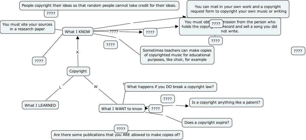 CopyrightKWL-Nicole, What I KNOW ???? ????, What I KNOW ???? ????, Copyright K What I KNOW, Copyright W What I WANT to know, What I KNOW You must obtain permission from the person who holds the copyright to record and sell a song you did not write., What I KNOW You can mail in your own work and a copyright request form to copyright your own music or writing, Copyright L What I LEARNED, What I WANT to know Is a copyright anything like a patent?, ???? ???? You can mail in your own work and a copyright request form to copyright your own music or writing, What I KNOW You must site your sources in a research paper