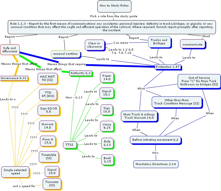 TTSI Leads to Paper 14.0, Other than Main Track Condition Message (SI) When Before initiating movement 6.2, TTSI Leads to Sign 16.0, Before initiating movement 6.2 How Mandatory Directives 2.14, Tracks and Bridiges Can mean Clear or clearance, Single selected speed ???? Form A 15.0, communicate Leads to Protection 1.47, Single selected speed ???? Warrant 14.0, Single selected speed ???? HAZ MAT 50 (SI), Authority 6.3 How - 6.13 TTSI , Single selected speed and a speed for Turnouts (SI), TTSI Leads to Voice 9.15, TTSI Leads to Rule 6.13, Single selected speed ???? Sign 60/30 5.5, Governance 6.31 Leads to a Single selected speed, Rule 1.1.3 - Report by the first means of communications any accidents; personal injuries; defectrs in tracks,bridges, or gignals; or any unusual condition that may affect the sagfe and efficient operation of the railroad. Where requreid, furnish report promptly after reporting the incident Must communicate, Safe and efficicient Means things that require Protection 1.47, TTSI Leads to Book 6.15, unusual contiion Leads to Protection 1.47, Main Track & sidings Track Warrant 14.0 When Before initiating movement 6.2, Clear or clearance Leads to 1.2 6.8 7.6 7.8 7.10 Protection 1.47, Tracks and Bridiges Leads to Protection 1.47, Rule 1.1.3 - Report by the first means of communications any accidents; personal injuries; defectrs in tracks,bridges, or gignals; or any unusual condition that may affect the sagfe and efficient operation of the railroad. Where requreid, furnish report promptly after reporting the incident Report unusual contiion, Safe and efficicient Means things that affect Governance 6.31, How to Study Rules Pick a rule from the study guide Rule 1.1.3 - Report by the first means of communications any accidents; personal injuries; defectrs in tracks,bridges, or gignals; or any unusual condition that may affect the sagfe and efficient operation of the railroad. Where requreid, furnish report promptly after reporting the incident, Single selected speed ???? Timetable (SI), Single selected speed ???? TTD 45 (WO), Out of Service From "C" for Main Tack Walkways on bridges (SI) When Before initiating movement 6.2, Single selected speed ???? Signal 10.0, Safe and efficicient Means things that affect Authority 6.3, TTSI Leads to Signal 10.1, Protection 1.47 What Main Track & sidings Track Warrant 14.0, Protection 1.47 What Other than Main Track Condition Message (SI), Protection 1.47 What Out of Service From "C" for Main Tack Walkways on bridges (SI), Rule 1.1.3 - Report by the first means of communications any accidents; personal injuries; defectrs in tracks,bridges, or gignals; or any unusual condition that may affect the sagfe and efficient operation of the railroad. Where requreid, furnish report promptly after reporting the incident Report Tracks and Bridiges, Rule 1.1.3 - Report by the first means of communications any accidents; personal injuries; defectrs in tracks,bridges, or gignals; or any unusual condition that may affect the sagfe and efficient operation of the railroad. Where requreid, furnish report promptly after reporting the incident Report Safe and efficicient