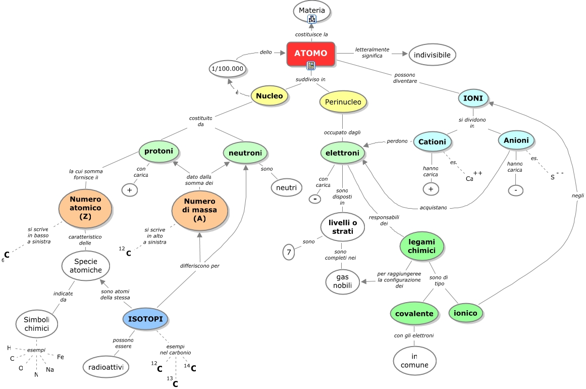 Questa Cmap, creata con IHMC CmapTools, contiene informazioni relative a: L'atomo, neutroni sono neutri, ATOMO suddiviso in Nucleo, livelli o strati sono 7, ionico negli IONI, Simboli chimici esempi H, ISOTOPI possono essere radioattivi, ISOTOPI esempi nel carbonio C, ATOMO costituisce la Materia, Numero di massa (A) dato dalla somma dei neutroni, elettroni con carica -, Simboli chimici esempi C, Simboli chimici esempi Fe, Specie atomiche indicate da Simboli chimici, Cationi perdono elettroni, Cationi es. Ca, Numero di massa (A) si scrive in alto a sinistra C, Simboli chimici esempi N, IONI si dividono in Anioni, Nucleo è 1/100.000, Nucleo costituito da protoni