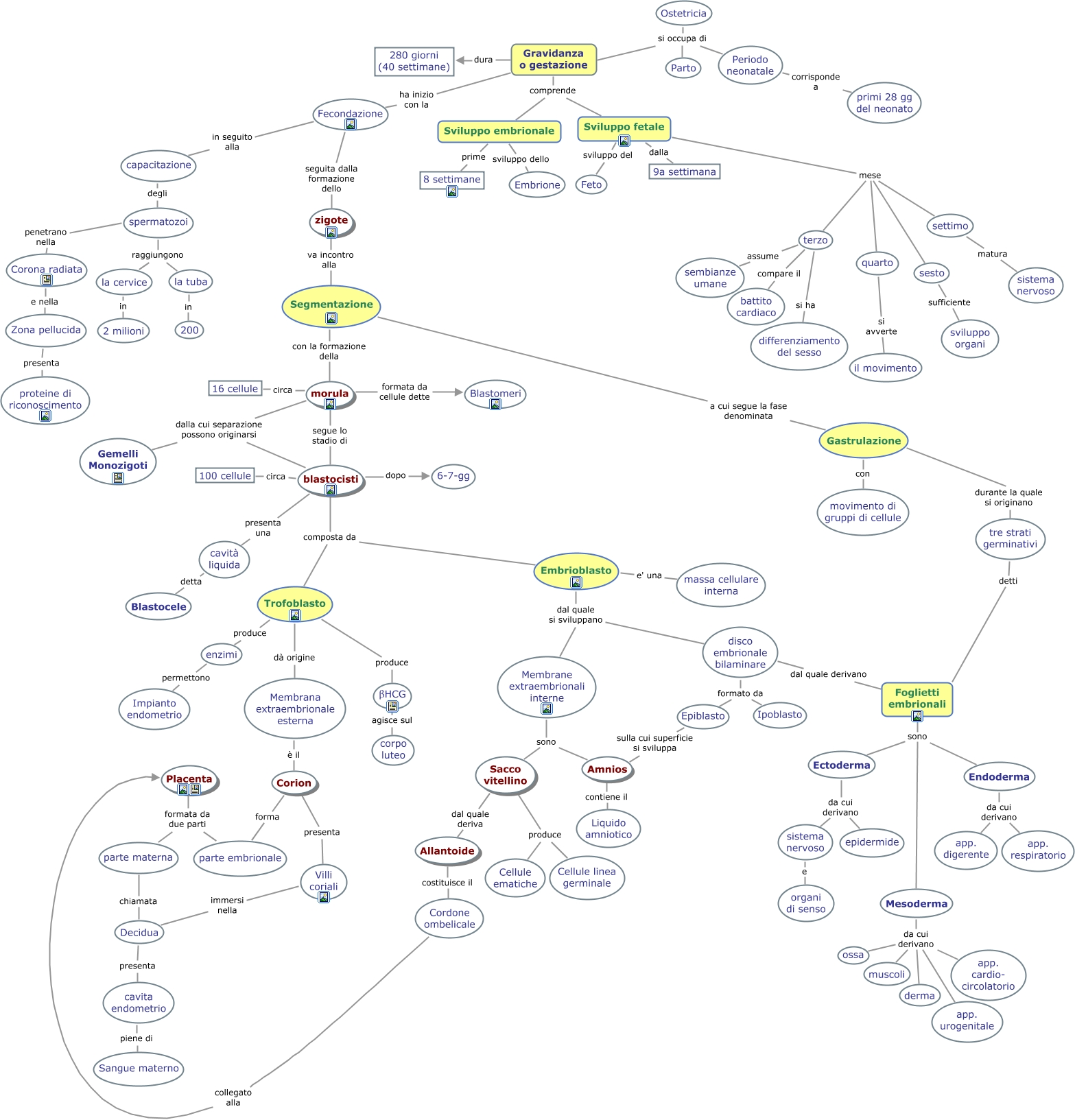Questa Cmap, creata con IHMC CmapTools, contiene informazioni relative a: Mappa_sviluppo_embrionale_fetale, Segmentazione a cui segue la fase denominata Gastrulazione, Sviluppo fetale mese terzo, morula formata da cellule dette Blastomeri, Periodo neonatale corrisponde a primi 28 gg del neonato, morula segue lo stadio di blastocisti, Epiblasto sulla cui superficie si sviluppa Amnios, Corona radiata e nella Zona pellucida, terzo si ha differenziamento del sesso, Mesoderma da cui derivano app. cardio- circolatorio, blastocisti dopo 6-7-gg, Gravidanza o gestazione comprende Sviluppo fetale, Sviluppo fetale sviluppo del Feto, spermatozoi raggiungono la cervice, Allantoide costituisce il Cordone ombelicale, blastocisti composta da Embrioblasto, Zona pellucida presenta proteine di riconoscimento, Membrane extraembrionali interne sono Sacco vitellino, blastocisti presenta una cavità liquida, quarto si avverte il movimento, terzo assume sembianze umane