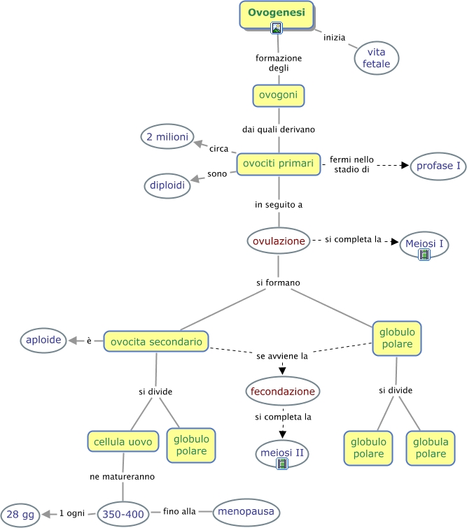 Questa Mappa Concettuale ha informazioni correlate a: Mappa_Ovogenesi, globulo polare se avviene la fecondazione, ovogoni dai quali derivano ovociti primari, globulo polare si divide globula polare, ovocita secondario se avviene la fecondazione, ovociti primari circa 2 milioni, ovocita secondario si divide globulo polare, 350-400 1 ogni 28 gg, ovocita secondario è aploide, 350-400 fino alla menopausa, Ovogenesi formazione degli ovogoni, ovocita secondario si divide cellula uovo, cellula uovo ne matureranno 350-400, ovulazione si completa la Meiosi I, globulo polare si divide globulo polare, ovociti primari in seguito a ovulazione, fecondazione si completa la meiosi II, ovociti primari sono diploidi, ovociti primari fermi nello stadio di profase I, ovulazione si formano globulo polare, Ovogenesi inizia vita fetale
