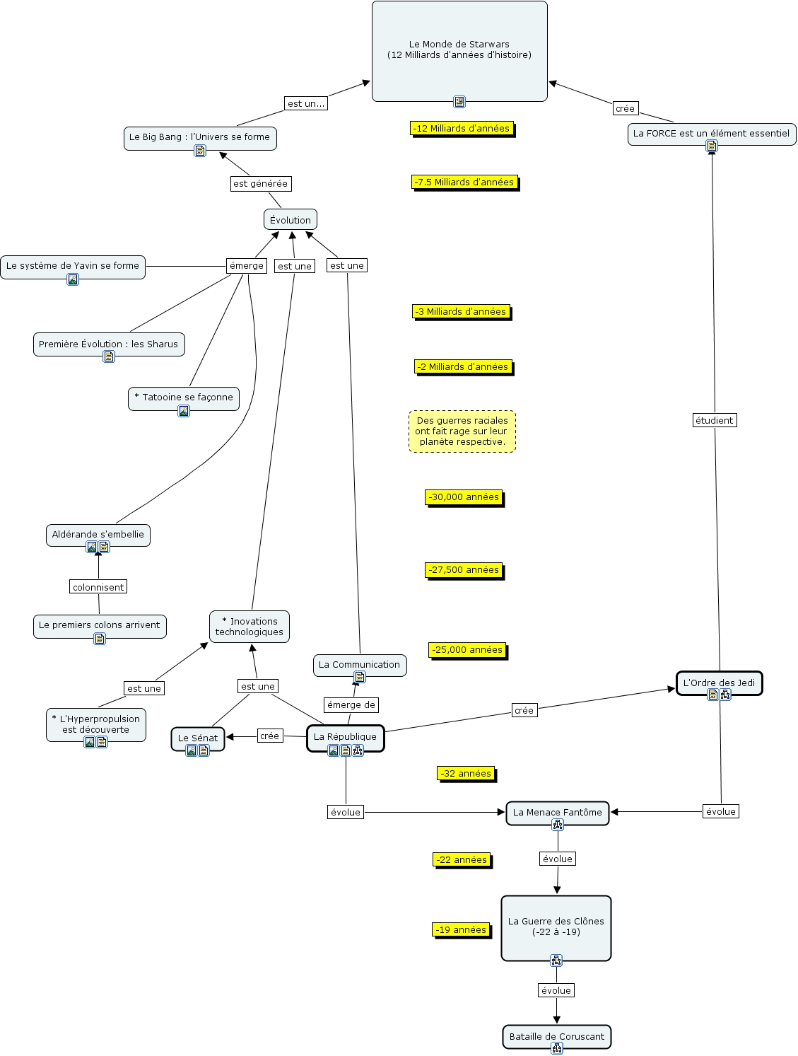 INDEX, * Tatooine se façonne émerge Évolution, Première Évolution : les Sharus émerge Évolution, Aldérande s'embellie émerge Évolution, * L'Hyperpropulsion est découverte est une * Inovations technologiques, La République émerge de La Communication, La FORCE est un élément essentiel crée Le Monde de Starwars (12 Milliards d'années d'histoire), Le système de Yavin se forme émerge Évolution, Le Sénat est une La République, La République évolue La Menace Fantôme, La Menace Fantôme évolue La Guerre des Clônes (-22 à -19)
