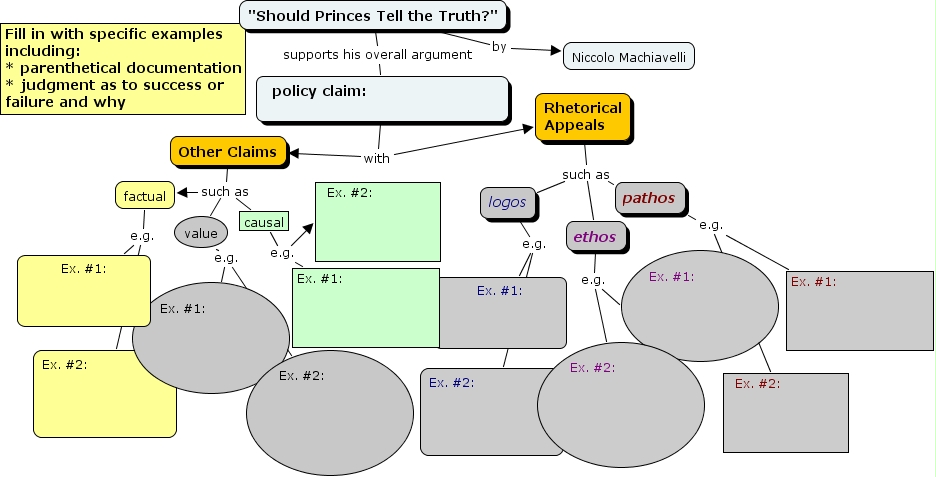 EssayScaffolding4, ethos e.g. Ex. #1:, "Should Princes Tell the Truth?" supports his overall argument policy claim:, logos e.g. Ex. #2:, Other Claims such as factual, Other Claims such as causal, "Should Princes Tell the Truth?" by Niccolo Machiavelli, pathos e.g. Ex. #2:, causal e.g. Ex. #2:, logos e.g. Ex. #1:, factual e.g. Ex. #1:
