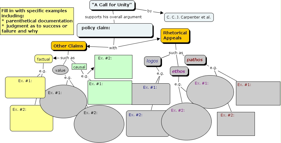 EssayScaffolding3, ethos e.g. Ex. #1:, "A Call for Unity" supports his overall argument policy claim:, logos e.g. Ex. #2:, Other Claims such as factual, Other Claims such as causal, "A Call for Unity" by C. C. J. Carpenter et al., pathos e.g. Ex. #2:, causal e.g. Ex. #2:, logos e.g. Ex. #1:, factual e.g. Ex. #1: