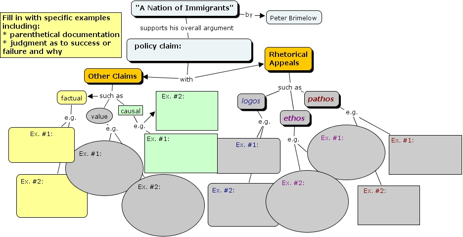 EssayScaffolding, ethos e.g. Ex. #1:, "A Nation of Immigrants" supports his overall argument policy claim:, logos e.g. Ex. #2:, Other Claims such as factual, Other Claims such as causal, "A Nation of Immigrants" by Peter Brimelow, pathos e.g. Ex. #2:, causal e.g. Ex. #2:, logos e.g. Ex. #1:, factual e.g. Ex. #1:
