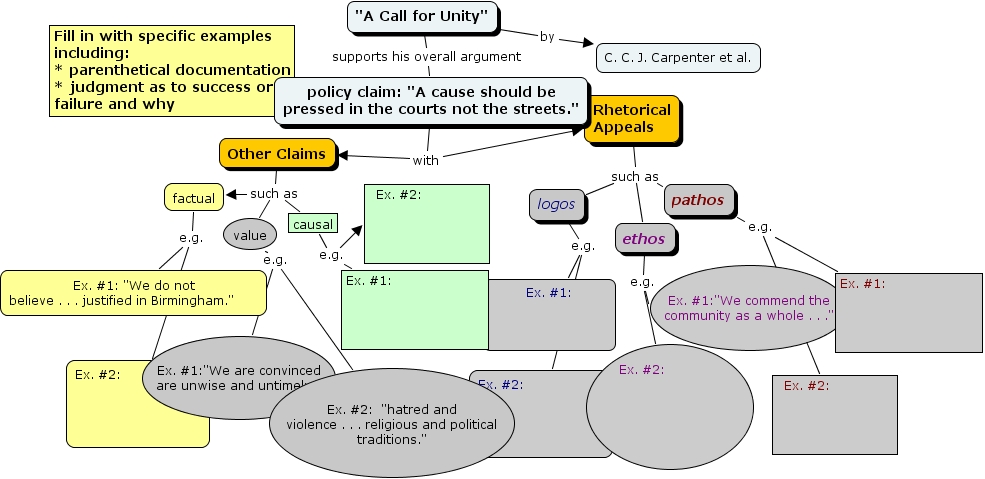 EssayScaffolding3Carp, ethos e.g. Ex. #1:"We commend the community as a whole . . .", "A Call for Unity" supports his overall argument policy claim: "A cause should be pressed in the courts not the streets.", logos e.g. Ex. #2:, Other Claims such as factual, Other Claims such as causal, pathos e.g. Ex. #2:, "A Call for Unity" by C. C. J. Carpenter et al., logos e.g. Ex. #1:, causal e.g. Ex. #2:, factual e.g. Ex. #1: "We do not believe . . . justified in Birmingham."