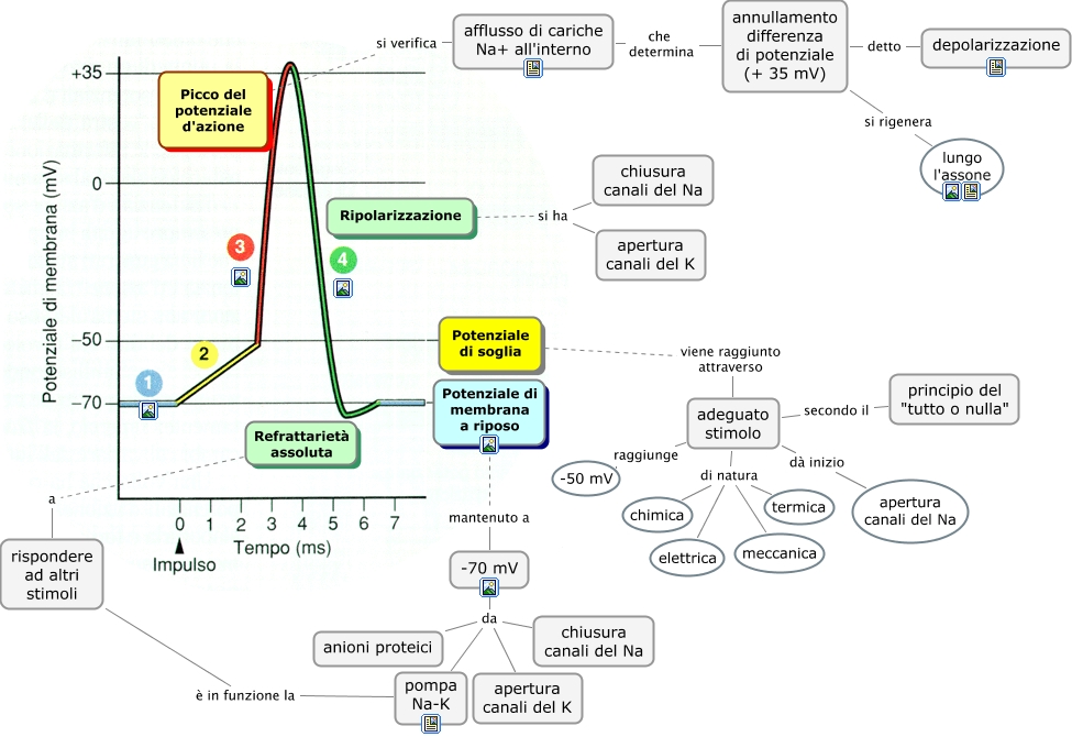 Questa Cmap, creata con IHMC CmapTools, contiene informazioni relative a: Potenziale_di_azione, Potenziale di membrana a riposo mantenuto a -70 mV, adeguato stimolo secondo il principio del "tutto o nulla", -70 mV da anioni proteici, rispondere ad altri stimoli è in funzione la pompa Na-K, Ripolarizzazione si ha chiusura canali del Na, Potenziale di soglia viene raggiunto attraverso adeguato stimolo, adeguato stimolo dà inizio apertura canali del Na, Picco del potenziale d'azione si verifica afflusso di cariche Na+ all'interno, adeguato stimolo di natura chimica, adeguato stimolo di natura termica, -70 mV da chiusura canali del Na, adeguato stimolo raggiunge -50 mV, adeguato stimolo di natura elettrica, adeguato stimolo di natura meccanica, annullamento differenza di potenziale (+ 35 mV) si rigenera lungo l'assone, Ripolarizzazione si ha apertura canali del K, -70 mV da apertura canali del K, Refrattarietà assoluta a rispondere ad altri stimoli, -70 mV da pompa Na-K, annullamento differenza di potenziale (+ 35 mV) detto depolarizzazione