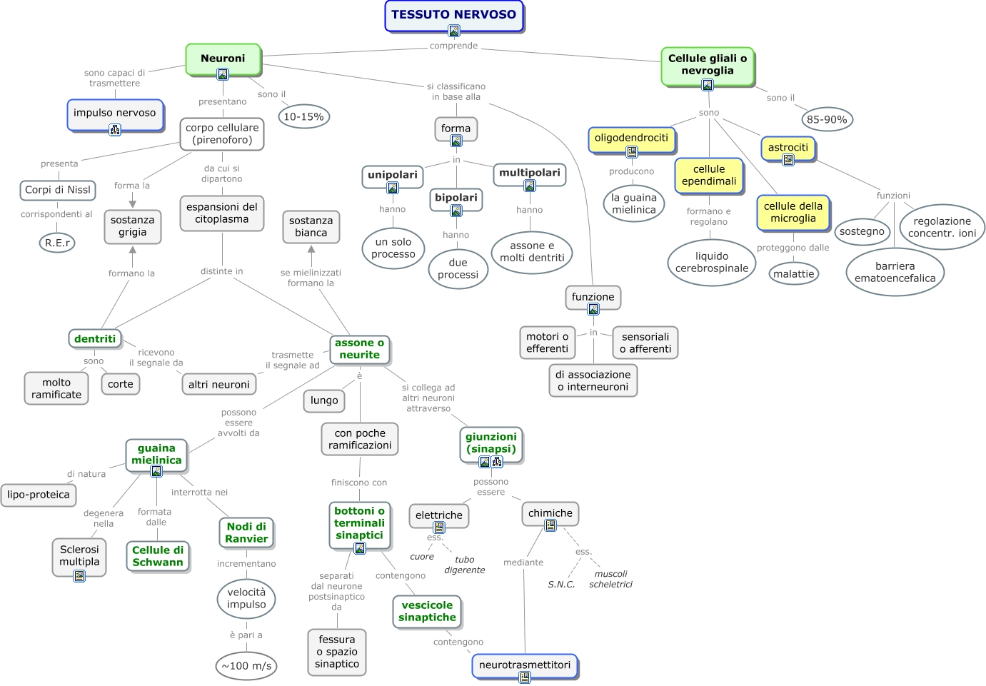 Questa Cmap, creata con IHMC CmapTools, contiene informazioni relative a: Tessuto_nervoso, velocità impulso è pari a ~100 m/s, Neuroni si classificano in base alla funzione, guaina mielinica degenera nella Sclerosi multipla, Cellule gliali o nevroglia sono il 85-90%, guaina mielinica di natura lipo-proteica, elettriche ess. cuore, Corpi di Nissl corrispondenti al R.E.r, assone o neurite possono essere avvolti da guaina mielinica, multipolari hanno assone e molti dentriti, Neuroni presentano corpo cellulare (pirenoforo), chimiche ess. muscoli scheletrici, dentriti ricevono il segnale da altri neuroni, bipolari hanno due processi, unipolari hanno un solo processo, astrociti funzioni regolazione concentr. ioni, corpo cellulare (pirenoforo) presenta Corpi di Nissl, Cellule gliali o nevroglia sono cellule ependimali, funzione in motori o efferenti, dentriti sono corte, cellule ependimali formano e regolano liquido cerebrospinale