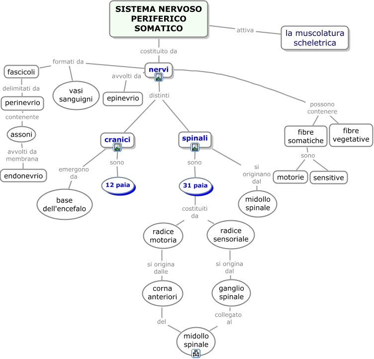 Questa Cmap, creata con IHMC CmapTools, contiene informazioni relative a: Sist_Nerv_Somatico, nervi possono contenere fibre vegetative, corna anteriori del midollo spinale, perinevrio contenente assoni, fibre somatiche sono sensitive, cranici emergono da base dell'encefalo, 31 paia costituiti da radice motoria, nervi distinti cranici, assoni avvolti da membrana endonevrio, spinali sono 31 paia, fascicoli delimitati da perinevrio, nervi possono contenere fibre somatiche, nervi distinti spinali, fibre somatiche sono motorie, spinali si originano dal midollo spinale, nervi avvolti da epinevrio, nervi formati da vasi sanguigni, SISTEMA NERVOSO PERIFERICO SOMATICO attiva la muscolatura scheletrica, ganglio spinale collegato al midollo spinale, radice sensoriale si origina dal ganglio spinale, radice motoria si origina dalle corna anteriori