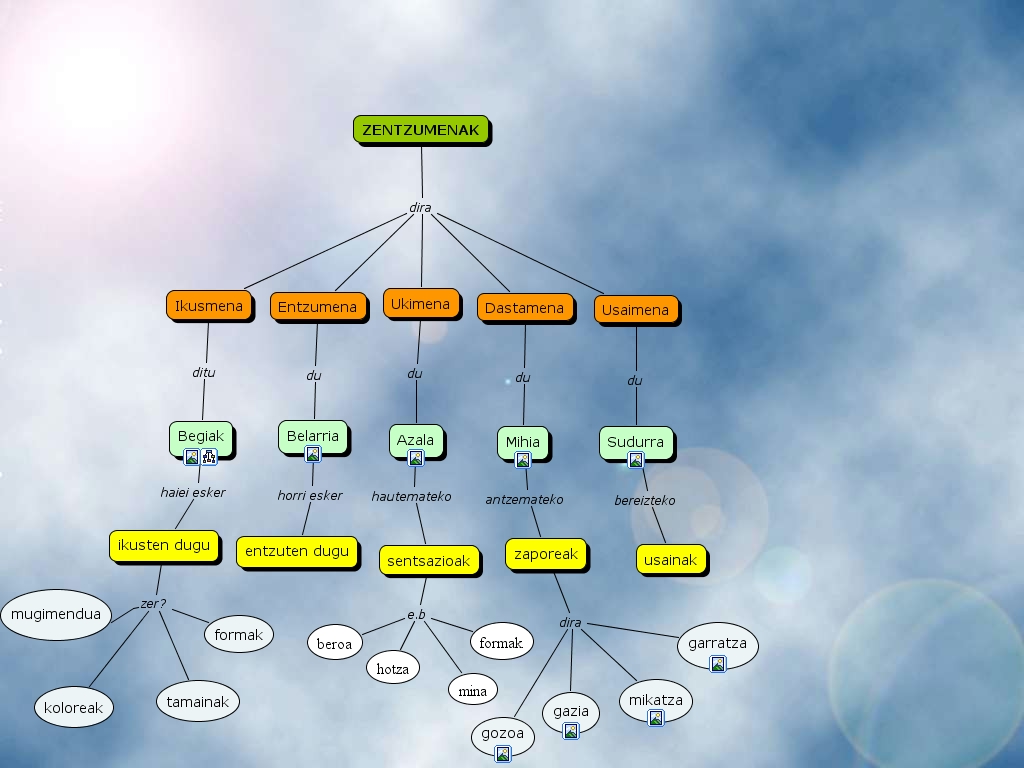 Zentzumenak, zaporeak dira gozoa, sentsazioak e.b mina, ZENTZUMENAK dira Ukimena, sentsazioak e.b beroa, Begiak haiei esker ikusten dugu, Entzumena du Belarria, ZENTZUMENAK dira Usaimena, Usaimena du Sudurra, Ukimena du Azala, zaporeak dira mikatza