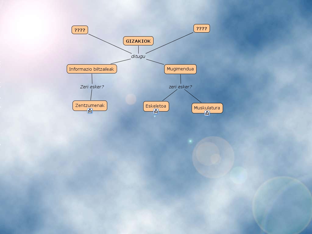 Gure gorputza, GIZAKIOK ditugu Mugimendua, GIZAKIOK ditugu ????, GIZAKIOK ditugu Informazio biltzaileak, GIZAKIOK ditugu ????, Mugimendua zeri esker? Muskulatura, Mugimendua zeri esker? Eskeletoa, Informazio biltzaileak Zeri esker? Zentzumenak