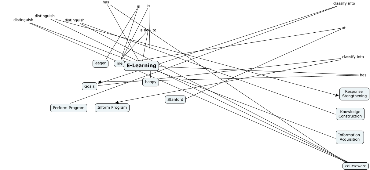 Sun-Young Map, me at Stanford, E-Learning has Goals, me is happy, Goals classify into Perform Program, E-Learning is new to me, me is eager, E-Learning has courseware, Goals classify into Inform Program, courseware distinguish Knowledge Construction, courseware distinguish Response Stengthening