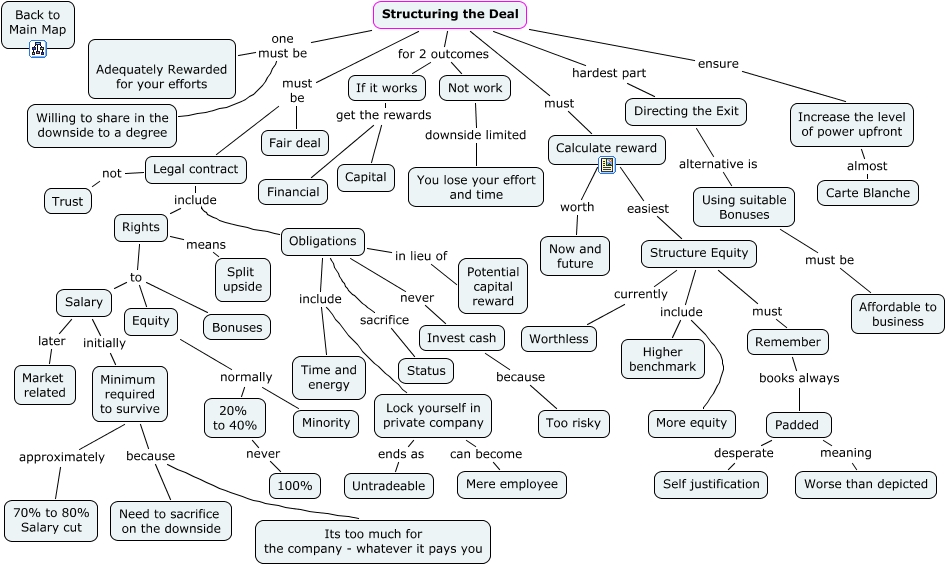 Structuring the deal, Remember books always Padded, Salary initially Minimum required to survive, Obligations never Invest cash, Legal contract include Rights, Invest cash because Too risky, Structuring the Deal one must be Adequately Rewarded for your efforts, Minimum required to survive approximately 70% to 80% Salary cut, Legal contract include Obligations, Equity normally 20% to 40%, Structuring the Deal must be Fair deal