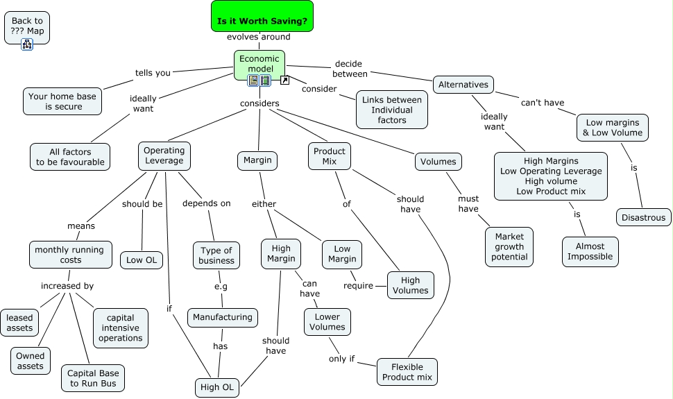 Este Mapa Conceitual tem informações relacionadas a: Worth Saving, Economic model ideally want All factors to be favourable, Economic model considers Margin, Is it Worth Saving? evolves around Economic model, monthly running costs increased by Capital Base to Run Bus, Volumes must have Market growth potential, Low Margin require High Volumes, Operating Leverage depends on Type of business, High Margin should have High OL, High Margin can have Lower Volumes, High Margins Low Operating Leverage High volume Low Product mix is Almost Impossible, Margin either Low Margin, High Margin can have Lower Volumes, Product Mix of High Volumes, monthly running costs increased by leased assets, monthly running costs increased by leased assets, Operating Leverage should be Low OL, Economic model considers Operating Leverage, Operating Leverage depends on Type of business, Manufacturing has High OL, Product Mix of High Volumes