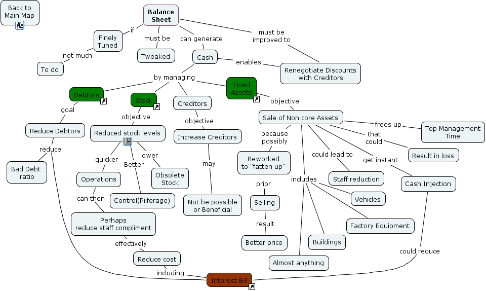 Balance sheet, Sale of Non core Assets frees up Top Management Time, Cash Injection could reduce Interest Bill, Cash by managing Fixed Assets, Cash enables Renegotiate Discounts with Creditors, Stock objective Reduced stock levels, Operations can then Perhaps reduce staff compliment, Sale of Non core Assets because possibly Reworked to "fatten up", Balance Sheet must be improved to Renegotiate Discounts with Creditors, Perhaps reduce staff compliment effectively Reduce cost, Reduce Debtors reduce Interest Bill
